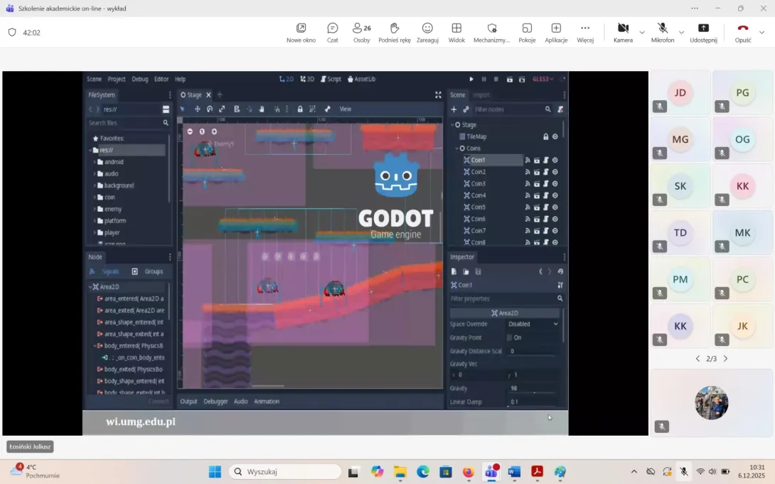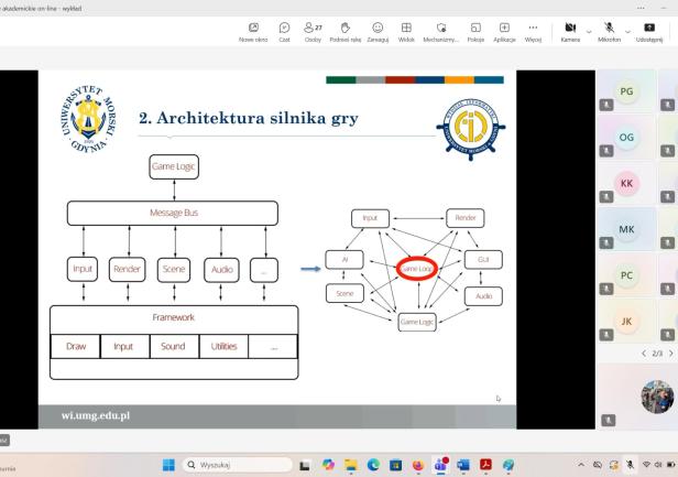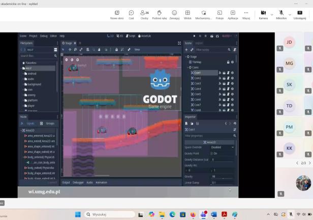 Szkolenie akademickie on-line z informatyki pt. Silniki do tworzenia gier: Godot odbyło się zdalnie na MsTeams. Na początku szkolenia odbył się wykład pt. Silniki do tworzenia gier: Godot z Pomorza. Podczas wykładu uczniowie poznali podstawy działania silnika graficznego oraz jego teoretyczne fundamenty w tym strumień renderowania oraz  komunikację z układem graficznym przy użyciu programowalnego interfejsu grafiki. Następnie dowiedzieli się jakie moduły są odpowiedzialne za symulację zjawisk opartych na fizyce oraz dźwięku przestrzennego. W dalszej części przeprowadzone zostało porównanie popularnych silników do tworzenia gier takich jak Unity, Unreal Engine oraz Godot  z uwypukleniem ich zalet oraz zastosowań. Podczas zajęć praktycznych uczniowie mieli okazję zainstalować oprogramowanie Godot oraz stworzyć prostą grę komputerową z wykorzystaniem silnika Godot.