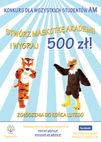 Projekty graficzne w formie wydruku o maksymalnym formacie A3 należy zgłaszać do Rektoratu ds. Kształcenia AM do końca lutego br. Konkurs będzie oceniało jury w skład, którego wejdą członkowie Komisji ds. Promocji AM. Jury wyłoni najlepszą pracę, która będzie wizytówką naszej Uczelni. Maskotka będzie wykorzystywana jako wizerunek Akademii przy różnego rodzaju kampaniach reklamowych oraz na wybranych materiałach promocyjnych.