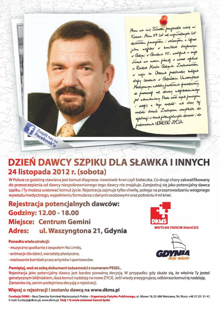A tak o sobie pisze bohater akcji: „Mam na imię Sławek, przyjaciele mówią mi Kaczor. Mam 59 lat od najmłodszych lat działałem, pomagałem i walczyłem o lepsze jutro, najpierw w komitecie strajkowym w Gdyni w Grudniu 70', następnie o swoje własne na morzu, później o nasze wspólne w Radzie Miasta Gdynia. Zachorowałem w maju br. Obecnie przechodzę kolejne etapy leczenia w Gdańskim Uniwersytecie Medycznym niestety powikłania spowodowały, że przeszczep od dawcy niespokrewnionego jest nieunikniony. Przez całe życie pomagam i czerpię z tego radość - nie chcę tej radości stracić. Zachęcam wszystkich do rejestracji w bazie potencjalnych dawców i do podarowania NOWEGO ŻYCIA.”
