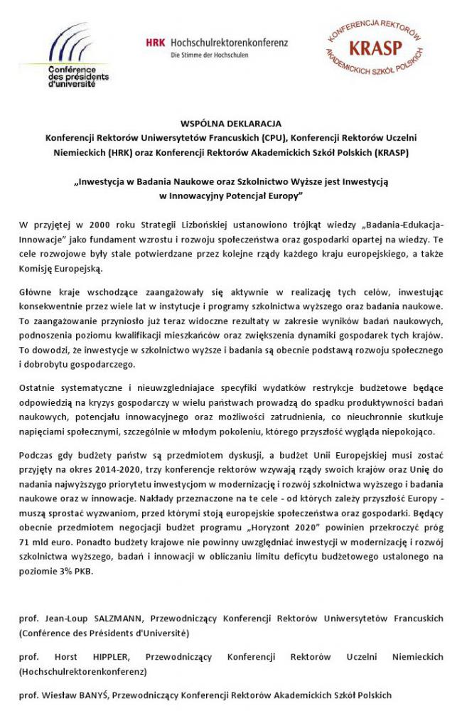 Konferencja Rektorów Uczelni Niemieckich, Konferencja Rektorów Uniwersytetów Francuskich oraz Konferencja Rektorów Akademickich Szkół Polskich wspólnie opracowały deklarację „Inwestycja w badania naukowe oraz szkolnictwo wyższe jest inwestycją w innowacyjny potencjał Europy”.
