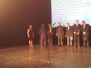 Fot. 2. Profesor dr hab. inż. Piotr Palich, Kierownik Katedry Organizacji Usług Turystyczno-Hotelarskich w towarzystwie Pani Dyrektor Departamentu Turystyki Urzędu Marszałkowskiego Województwa Pomorskiego Marty Chełkowskiej odbierający nagrodę za współpracę z Okazji 10-lecia PROT.