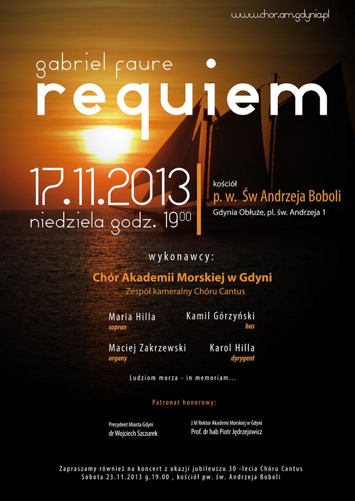 W dniu 17 listopada br. o godz. 19.00 zapraszamy do kościoła św. Andrzeja Boboli w Gdyni Obłużu na koncert Chóru Akademii Morskiej w Gdyni, Zespołu kameralnego Chóru Cantus oraz zaproszonych solistów, którzy wykonają m.in. przejmujące dzieło Gabriela Faure (czyt. Fore) - Requiem. Wydarzenie to będzie upamiętniać wszystkich tych, którzy zginęli na morzu, a o których jako mieszkańcy Miasta z Morza i Marzeń powinniśmy pamiętać. Koncert poświęcony jest również pamięci zmarłych pracowników Akademii Morskiej.