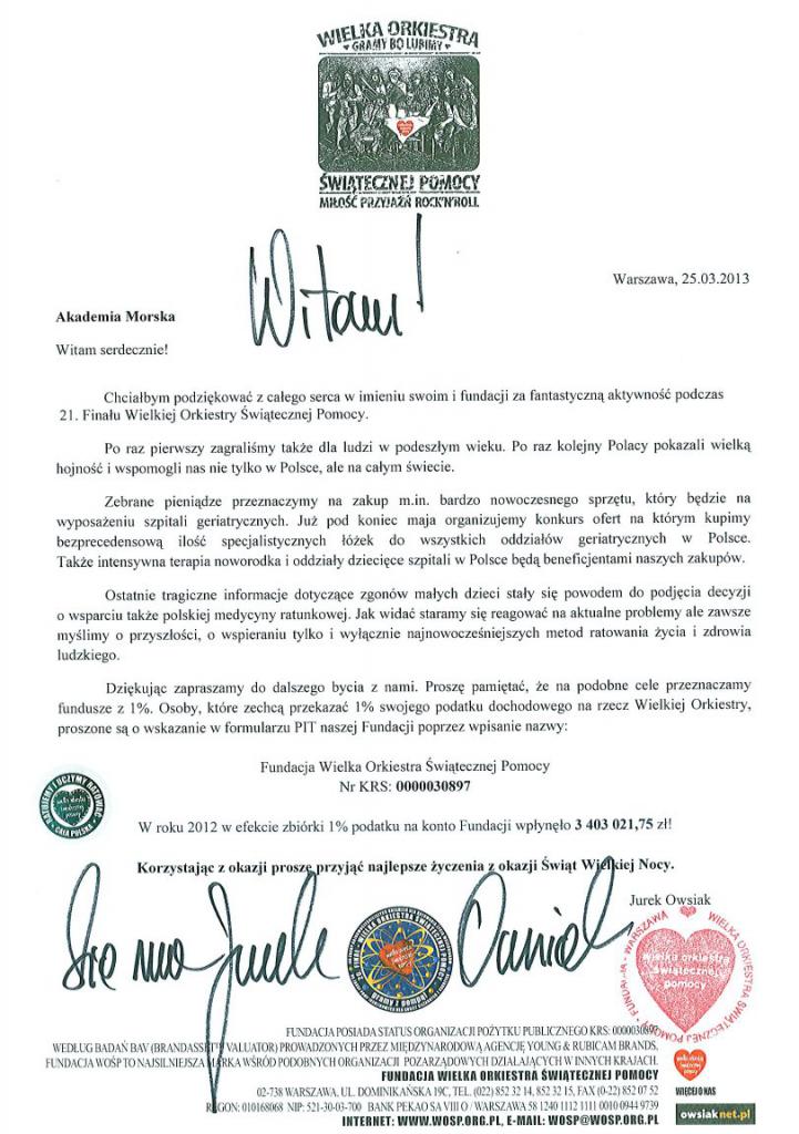 Akademia Morska w Gdyni otrzymała podziękowania od Fundacji Wielkiej Orkiestry Świątecznej Pomocy.