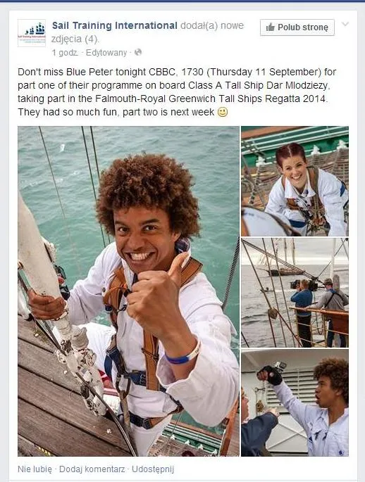 "Dar Młodzieży" stał się bohaterem najnowszego odcinka, popularnego, edukacyjnego magazynu morskiego  telewizji BBC "Blue Peter". Emisja pierwszej części programu już dzisiaj (czwartek 11 września), o godzinie 17.30 na kanale CBBC, o czym Sail Training International informuje na swoim Facebooku.