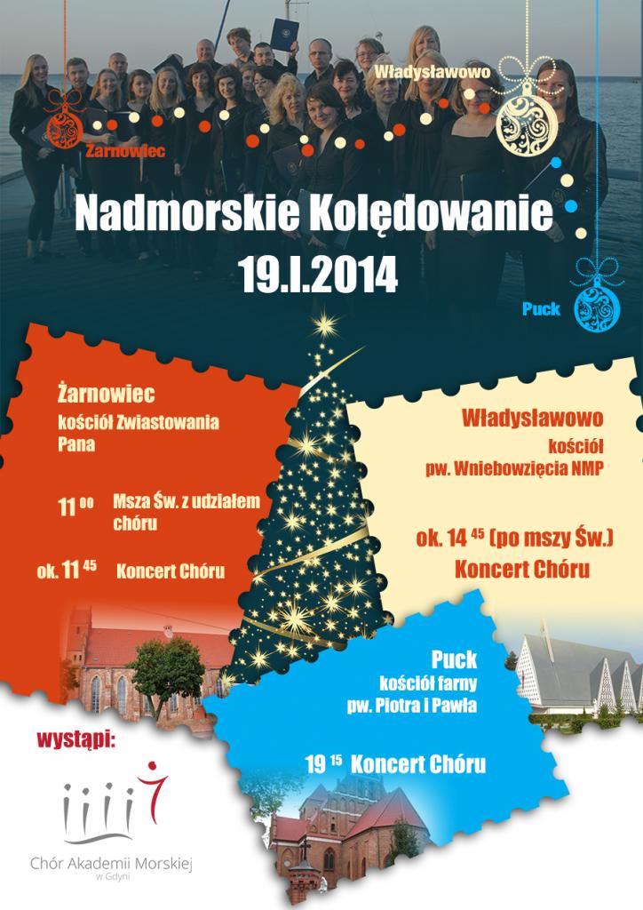 19 stycznia 2014 r. Chór Akademii Morskiej wyrusza na całodzienne kolędowanie. Zapowiada się dzień pełen muzycznych wrażeń, ponieważ nasz uczelniany Chór chce w ciągu jednego dnia odwiedzić z koncertem kolęd trzy nadmorskie miejscowości: Żarnowiec, Władysławowo, Puck. W programie znajdą się polskie, hiszpańskie, starocerkiewne i łacińskie pieśni bożonarodzeniowe. Szczegóły podane zostały na plakacie.