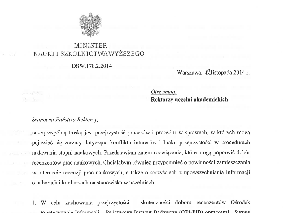 Minister Nauki i Szkolnictwa Wyższego Lena Kolarska-Bobińska napisała do rektorów uczelni akademickich list w sprawie przejrzystości procesów i procedur w sprawach, w których mogą pojawiać się zarzuty dotyczące konfliktu interesów i braku przejrzystości w procedurach nadawania stopni naukowych. Przedstawiła w nim m.in. rozwiązania, które mogą poprawić dobór recenzentów prac naukowych oraz nabory na stanowiska w uczelniach.