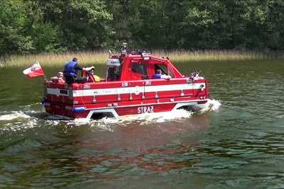 Amfibijny operacyjny pojazd ratowniczy (model II – Bukovina) podczas badań wodnych w Ośrodku Badawczo-Szkoleniowym Fundacji Bezpieczeństwa  Żeglugi i Ochrony Środowiska na Jeziorze Silm w Iławie-Kamionce – próba prędkości