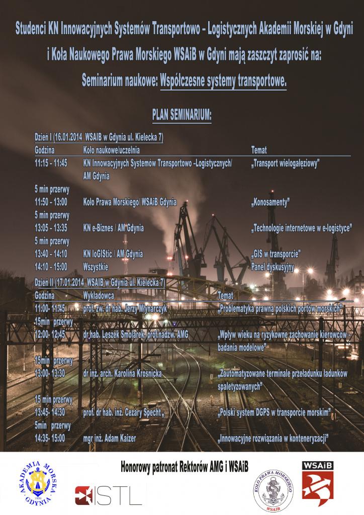 Koło Naukowe Innowacyjnych Systemów Transportowo – Logistycznych działające na Wydziale Nawigacyjnym Akademii Morskiej w Gdyni, oraz Koło Naukowe Prawa Morskiego działające na Wydziale Prawa i Administracji Wyższej Szkoły Administracji i Biznesu w Gdyni, serdecznie zapraszają zainteresowanych uczestnictwem w dwudniowym seminarium.