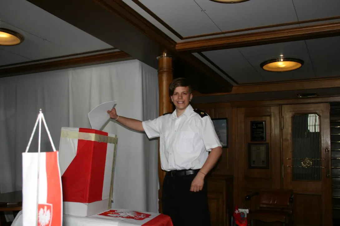 W niedzielę 25 maja, na znajdującym się na Bałtyku w ramach podróży szkoleniowej żaglowcu, powołana przez komendanta komisja wyborcza, rozpoczęła pracę w godzinach przewidzianych instrukcją. Szansę wypełnienia obywatelskiego obowiązku miało 126 członków załogi stałej oraz studentów Akademii Morskiej. Spośród uprawnionych do głosowania, skorzystało z niej 36 osób. Wpływ na niezbyt masowy udział, miał niewątpliwie obowiązek wcześniejszego zgłoszenia, w miejscu stałego zameldowania, chęci przystapieniu do wyborów w innym obwodzie. Poprzedzająca bezpośrednio rejs sesja egzaminacyjna, zaprzątała studentów problemami zupełnie innej natury.