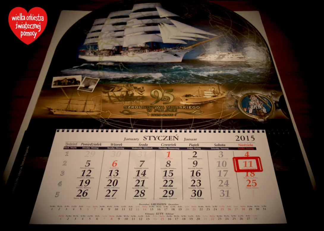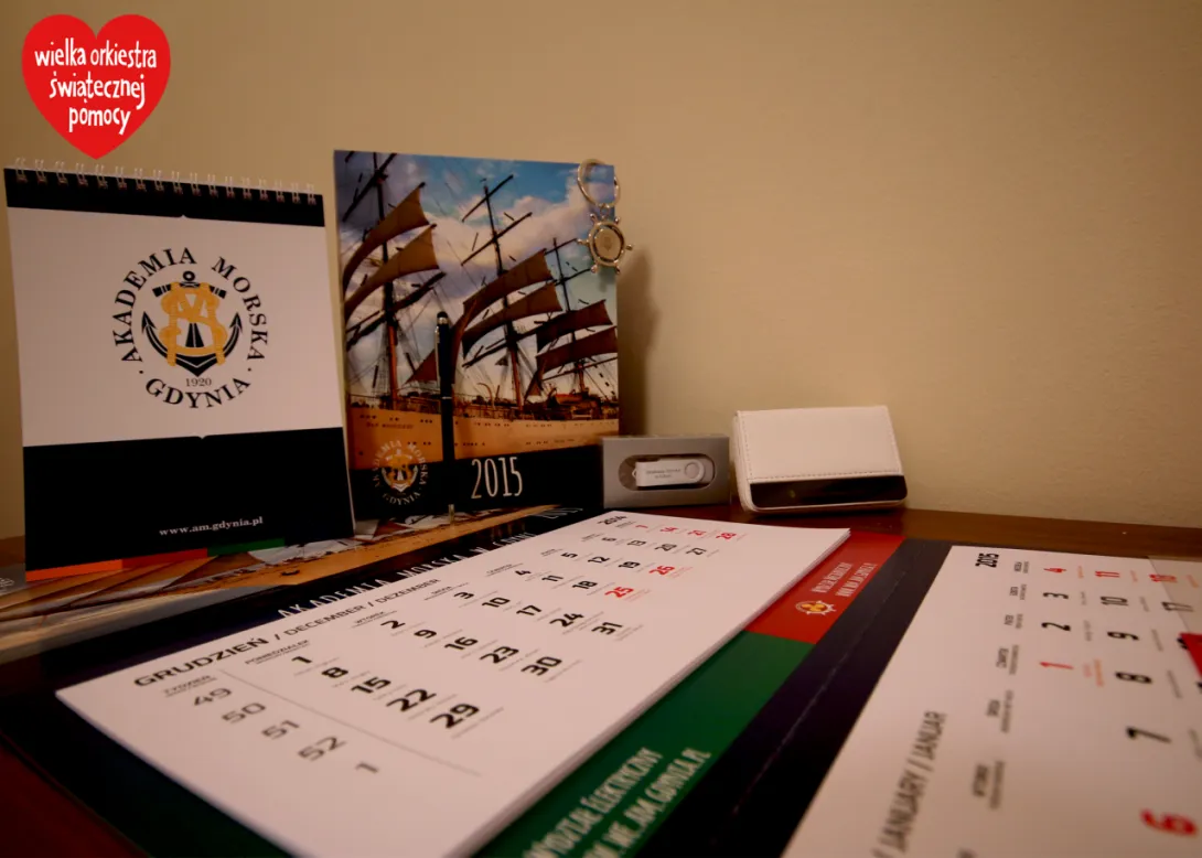 Uczestnicy Wielkiej Orkiestrowej Licytacji w Teatrze Miejskim im. Witolda Gombrowicza w Gdyni prócz upominków reklamowych przekazanych przez Uczelnię /czapki, notesy, długopisy, wizytowniki/ będą mieli okazję wylicytować wyjątkowy kalendarz ścienny Akademii Morskiej w Gdyni.