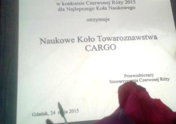 Dnia 18.05.2015r. podczas prezentacji na Uniwersytecie Gdańskim Naukowe Koło Towaroznawstwa CARGO zaprezentowało swój dotychczasowy dorobek naukowy, działania wykonywane na rzecz Uczelni, a także postępy i rozwój jaki czynią członkowie koła. Reprezentowali nas mgr inż. Natalia Chomaniuk – przewodnicząca koła oraz Mariusz Jakubowski. Poziom przedstawianych prac był bardzo wysoki, rywalizacja bardzo wyrównana. Podczas prezentacji członków koła porównano do ziaren kawy, które razem tworzą mocny aromatyczny napar, tak jak członkowie koła zgrany zespół.