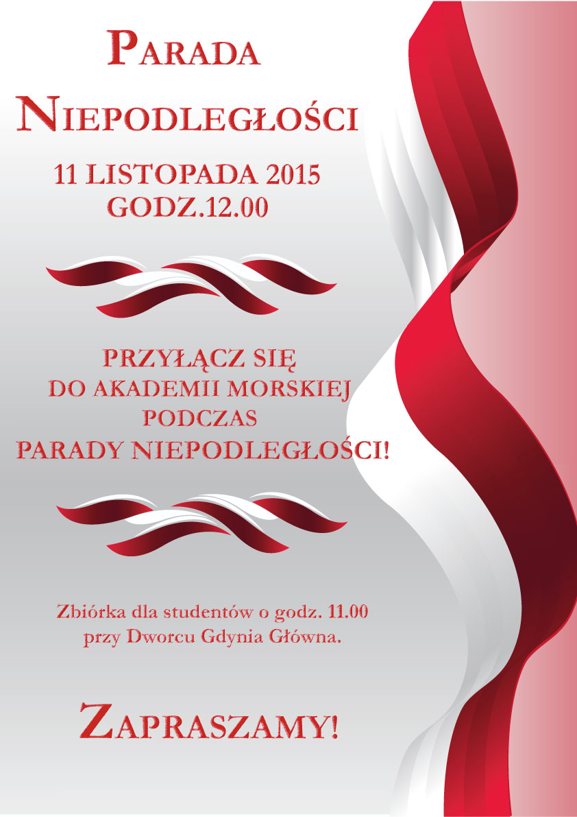 Jego Magnificencja Rektor Akademii Morskiej w Gdyni serdecznie zaprasza wszystkich pracowników oraz studentów wraz z rodzinami do udziału w Paradzie Niepodległości, która odbędzie się w dniu 11 listopada 2015 roku. Wydarzenie rozpocznie się o godz. 12.00. Zbiórka dla studentów Akademii Morskiej w Gdyni zaplanowana została na godz. 11.00 przy Dworcu Gdynia Główna. Pracownicy wraz z rodzinami proszeni są o przybycie o godz. 11.40.