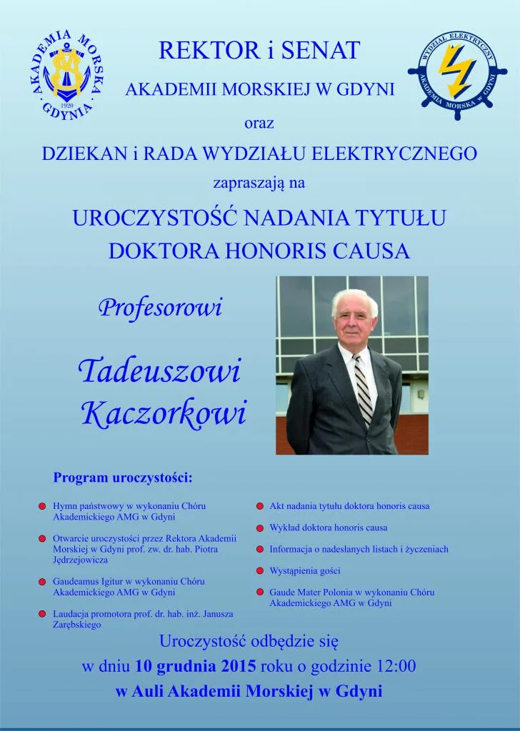 Uroczystość odbędzie się w dniu 10 grudnia 2015 roku o godzinie 12:00 Auli T. Meissnera w Akademii Morskiej w Gdyni.