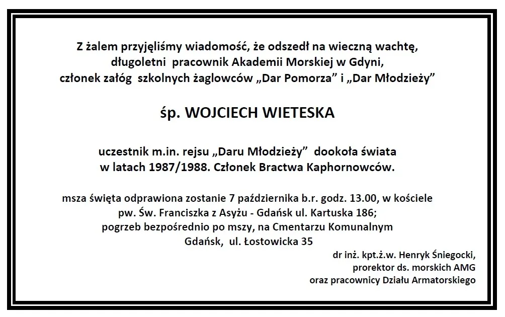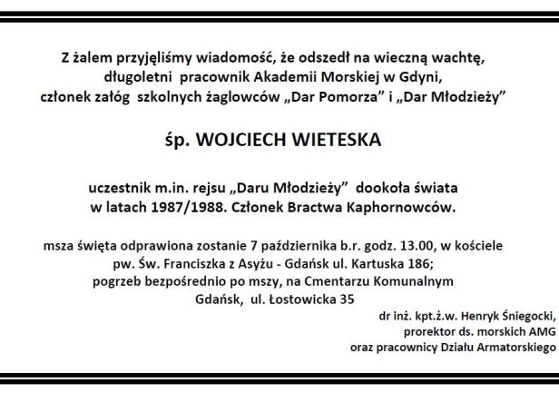 Po długiej walce z nieuleczalną chorobą zmarł Wojciech Wieteska, wieloletni pracownik Wyższej Szkoły/Akademii Morskiej w Gdyni, członek załóg żaglowców szkolnych "Dar Pomorza" i "Dar Młodzieży".