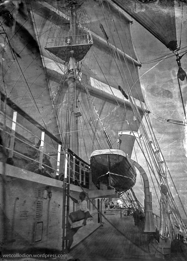 Pan Andrzej Górski musiał zatem zabrać na pokład, obok archaicznego aparatu ze statywem, przenośną ciemnię wraz ze wszystkimi niezbędnymi substancjami i osprzętem.  Technika „mokrej płyty”, stosowana do uzyskiwania negatywów, dominowała w fotografii po roku 1850 przez ok. 30  lat. Dzięki wysokiej czułości daję możliwość odwzorowania najdrobniejszych szczegółów, jednak  kilkusekundowe czasy naświetlania powodują, że fotografowane obiekty w ruchu – ludzie, przedmioty – tracą ostrość konturów. Gotowe czarno-białe fotogramy zachowują natomiast niepowtarzalną plastykę i urok artystycznych grafik.