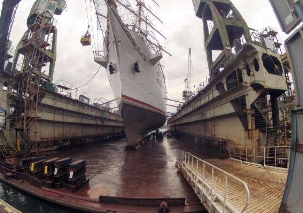 Wprawdzie fregata, mimo ponad 35–ciu lat intensywnej eksploatacji, wciąż zadziwia znakomitą kondycją, ale przepisy wymagają przeglądu potwierdzenia klasy. Przegląd ten to cykliczna procedura, powtarzana w połowie okresu tzw. klasy 5- letniej.  „Dar”  w Stoczni Remontowej „Nauta” trafił do doku pływającego, odsłaniając rzadko oglądaną część podwodną, która zostanie dokładnie oczyszczona następnie pomalowana specjalną antyporostową farbą, sprawdzone i wymienione zostaną elementy ochrony anodowej kadłuba.