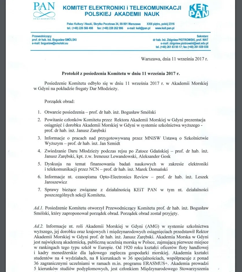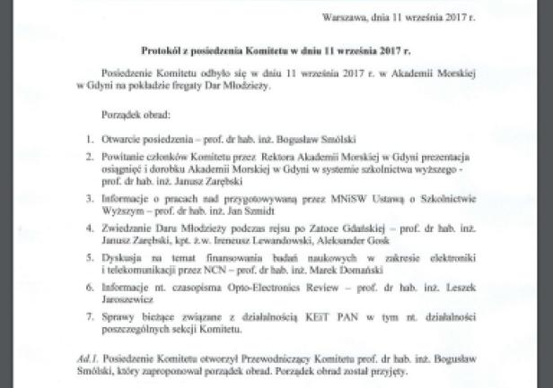 Sekretarz Komitetu, profesor Zbigniew Piotrowski załączając protokół z posiedzenia, napisał: Jeszcze raz ślicznie dziękuję za niezapomniane chwile spędzone na Darze Młodzieży podczas posiedzenia Komitetu Elektroniki i Telekomunikacji PAN. Reportaż z posiedzenia zamieściliśmy na stronie KEiT PAN.