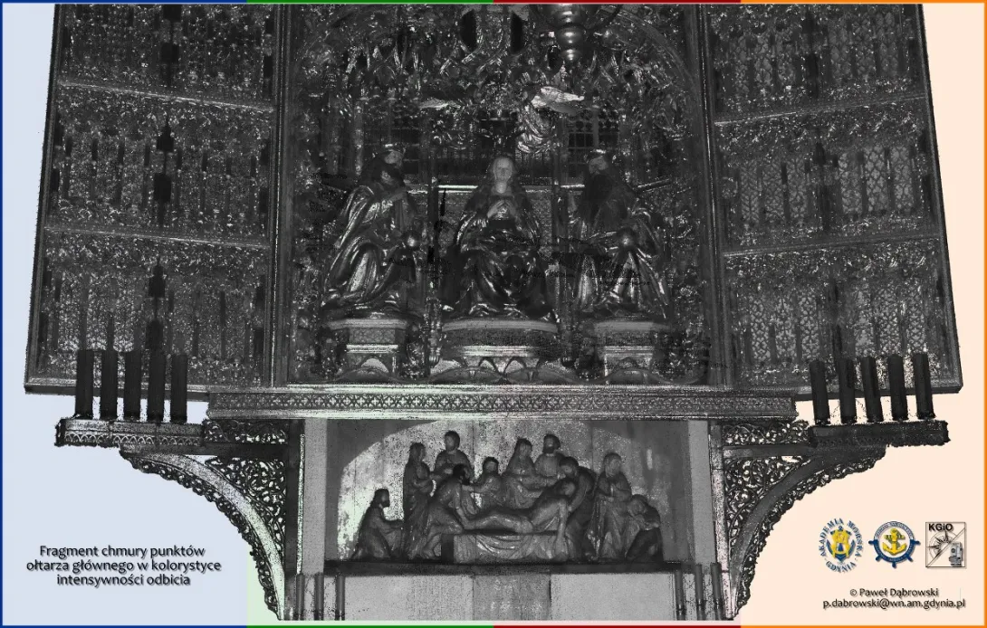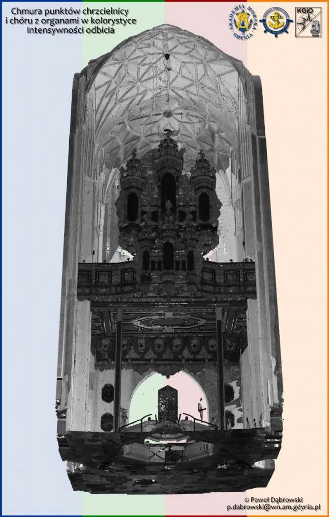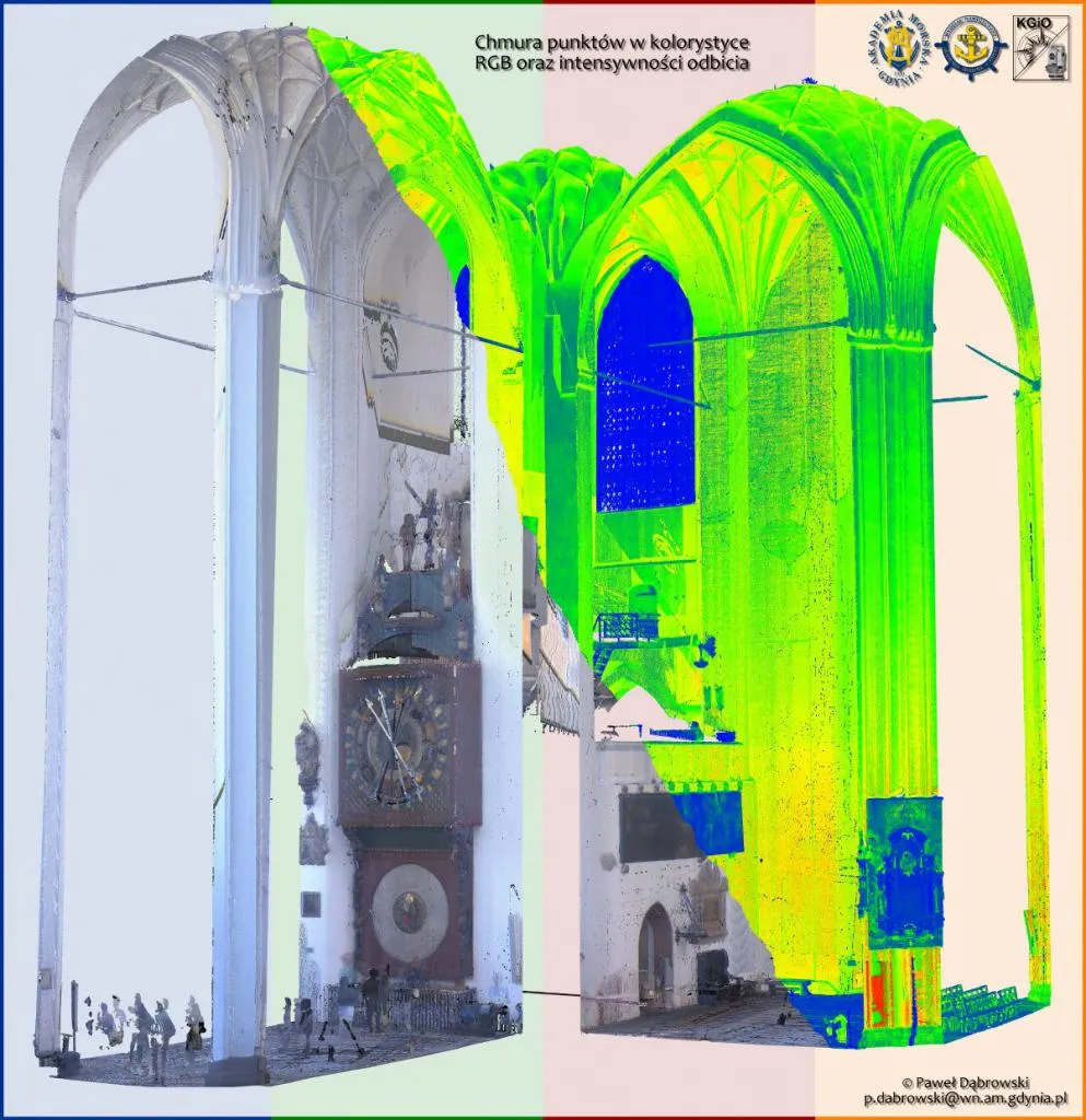 23 sierpnia 2017 r.  Paweł Dąbrowski, asystent w Katedra Geodezji i Oceanografii na Wydziale Nawigacyjnym, wraz z przedstawicielem firmy Geotronics Dystrybucja Sp. z o.o., Panem Bartoszem Balcerem, wykonali pomiar wnętrza Bazyliki Mariackiej w Gdańsku. Do pomiarów użyli skanera laserowego Trimble TX8.