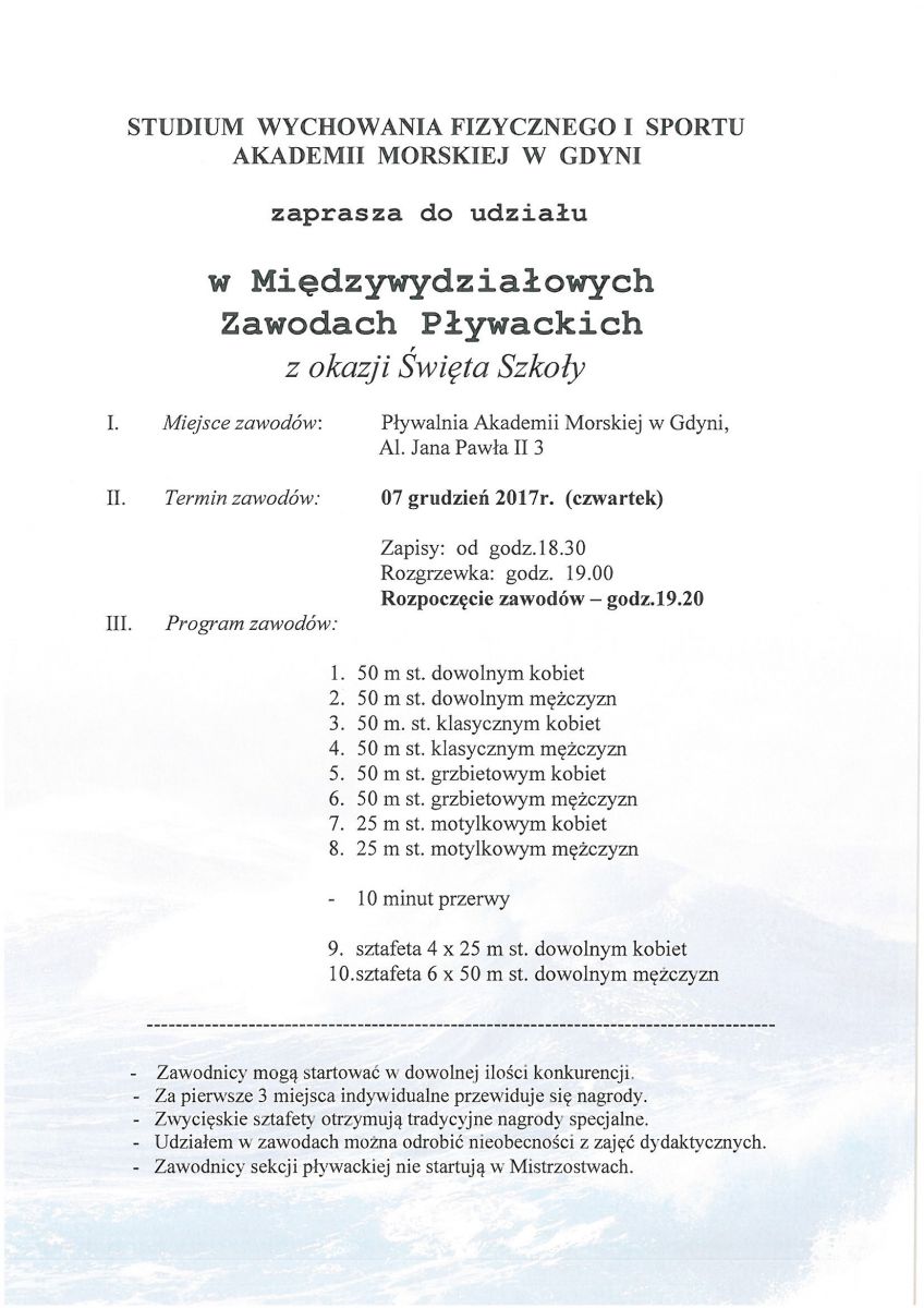W dniu 7 grudnia 2017 roku o godzinie 19.20 na pływalni Akademii Morskiej w Gdyni odbędą się Międzywydziałowe Zawody Pływackie. Konkurencje indywidualne stylami dowolnym, klasycznym i grzbietowym odbędą się na dystansie 50-cio metrowym zaś motylkowym 25-cio metrowym. W sztafetach zawodnicy płyną dystans 4x25 metrów stylem dowolnym (kobiety) i 6x50 metrów stylem dowolnym (mężczyzni). To właśnie sztafety punktują do ogólnej klasyfikacji międzywydziałowej.