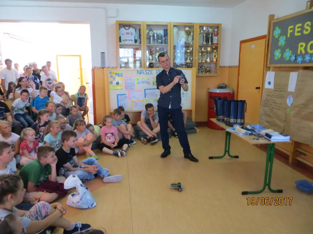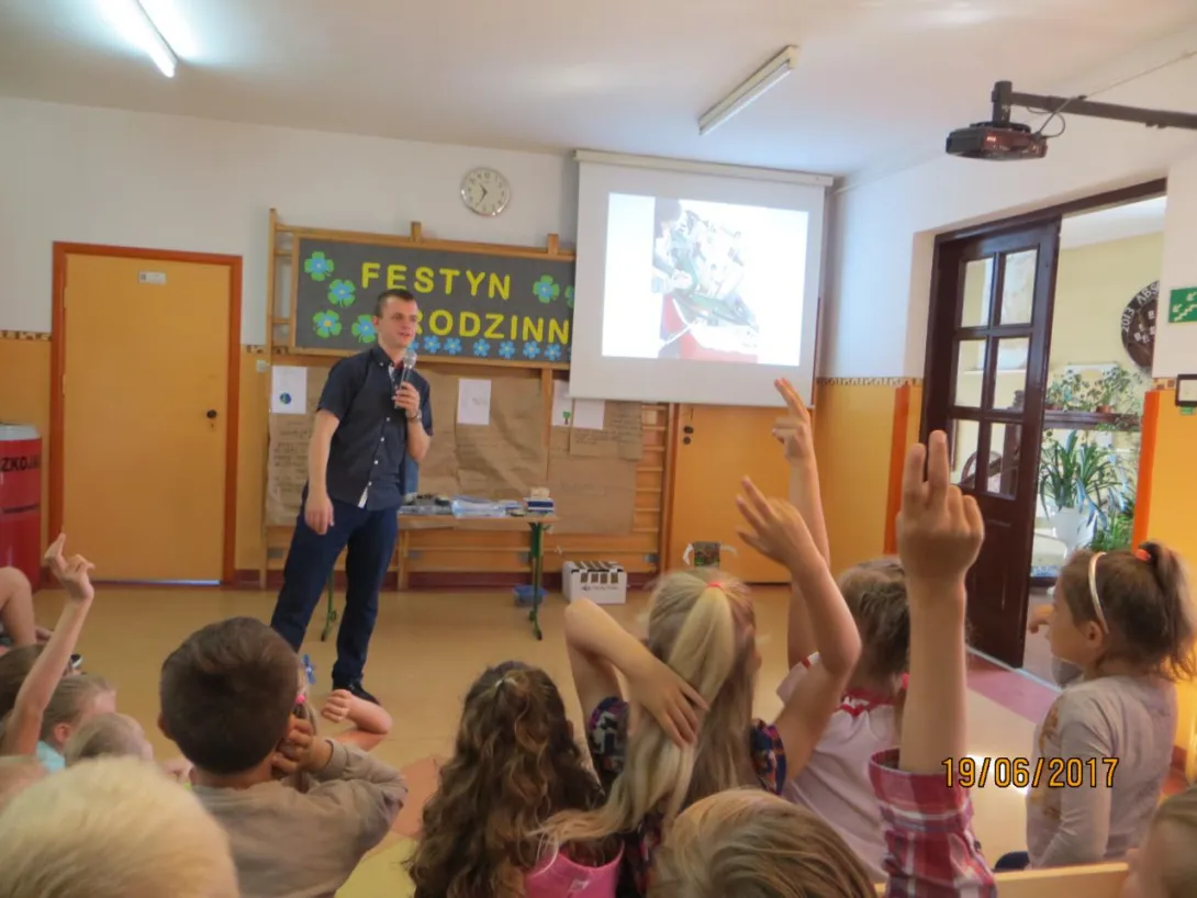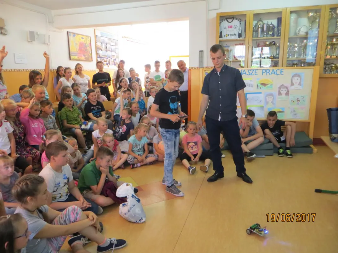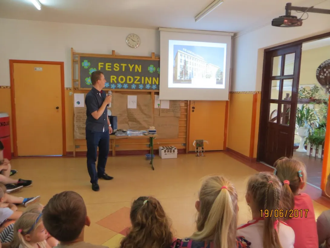 Dominik przedstawił jak wygląda życie i praca na statku. Jego prezentacja zawierała bardzo dużą ilość zdjęć z Horyzontu oraz Polskiej Stacji Polarnej Hornsund co w znacznym stopniu zainteresowało uczniów. Dzieci miały okazję sterować jednym z projektów Dominika: zdalnie sterowanym pojazdem trójkołowym zrealizowanym w ramach pracy inżynierskiej. Zaprezentował również projekt robota humanoidalnego eNBo, który został rozpoczęty jeszcze podczas studiów w Akademii. Dzieci miały okazję zadawać pytania, jak i również odpowiadać na pytania przygotowane przez naszego absolwenta.