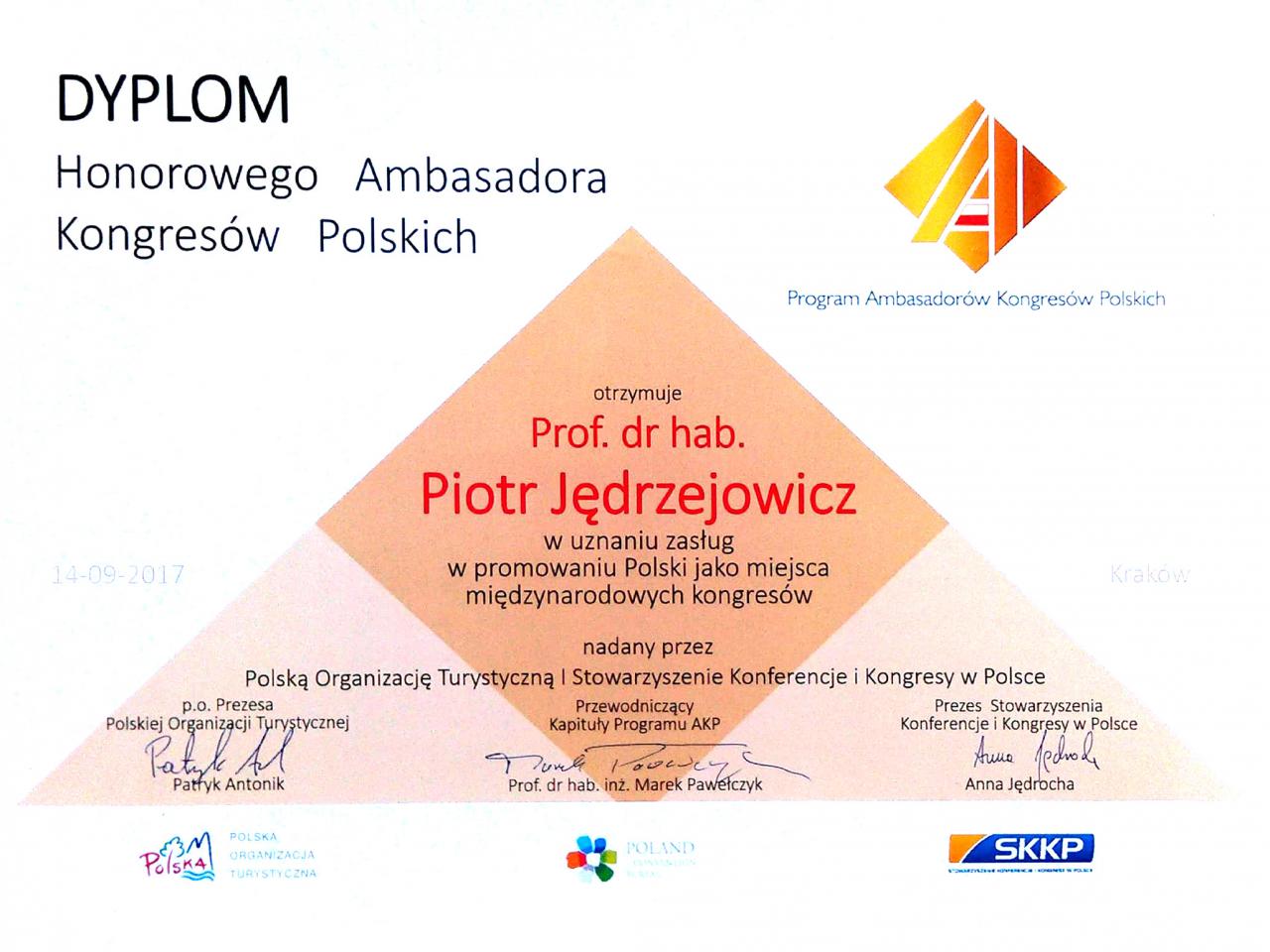 14 września 2017 roku w Krakowie miała miejsce Gala Ambasadorów Kongresów Polskich. W trakcie uroczystości wręczono dyplomy Honorowych Ambasadorów Kongresów Polskich. Jeden z dyplomów trafił w ręce Prof. Piotra Jędrzejowicza.