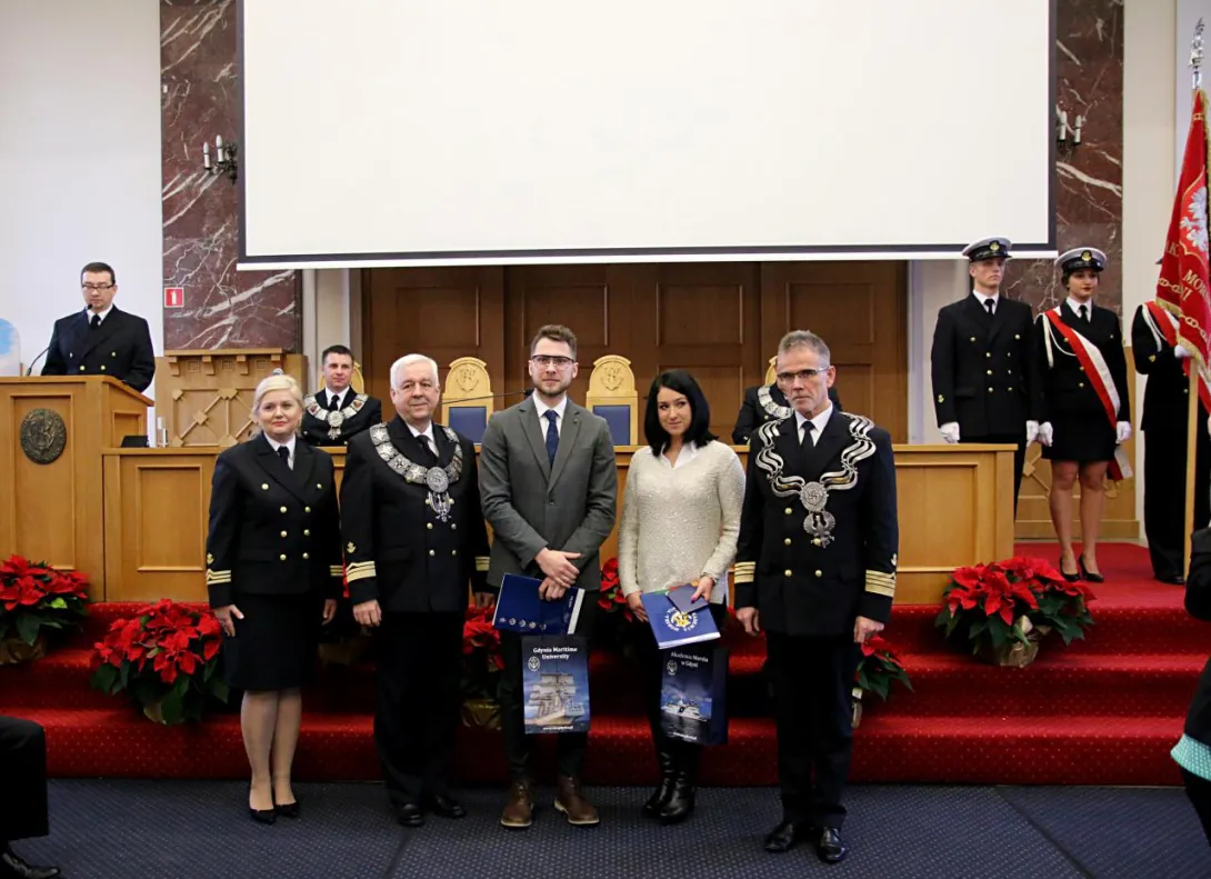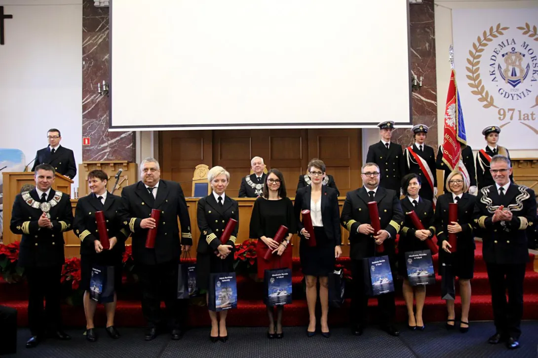 Jego Magnificencja Rektor prof. dr hab. inż. Janusz Zarębski  oraz Prorektor ds. Nauki dr hab. inż.  Ireneusz Czarnowski, prof. nadzw. AMG wręczyli dyplomy potwierdzające nadanie stopnia naukowego doktora habilitowanego oraz dyplomy doktorskie dla pracowników Akademii Morskiej w Gdyni: