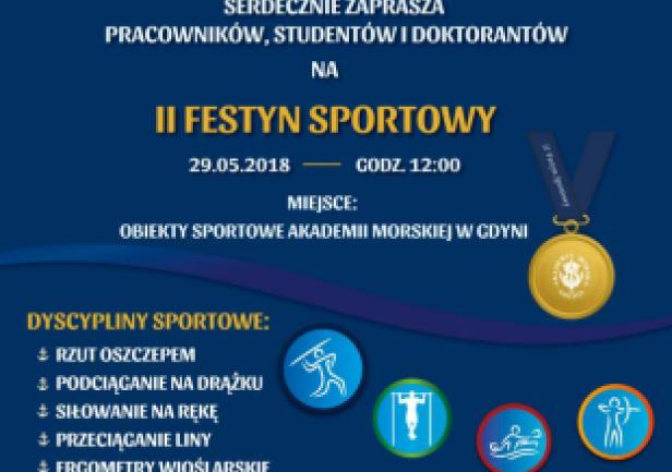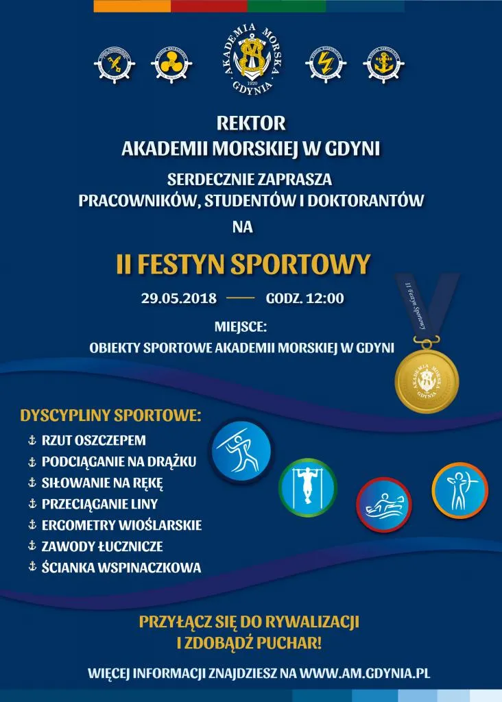 Rektor Akademii Morskiej w Gdyni zaprasza wszystkich studentów, doktorantów i pracowników na II Festyn Sportowy o Puchar JM Rektora AMG, który odbędzie się w dniu 29 maja 2018 roku (wtorek) od godz. 12:00 na terenie obiektów sportowych Akademii Morskiej w Gdyni.