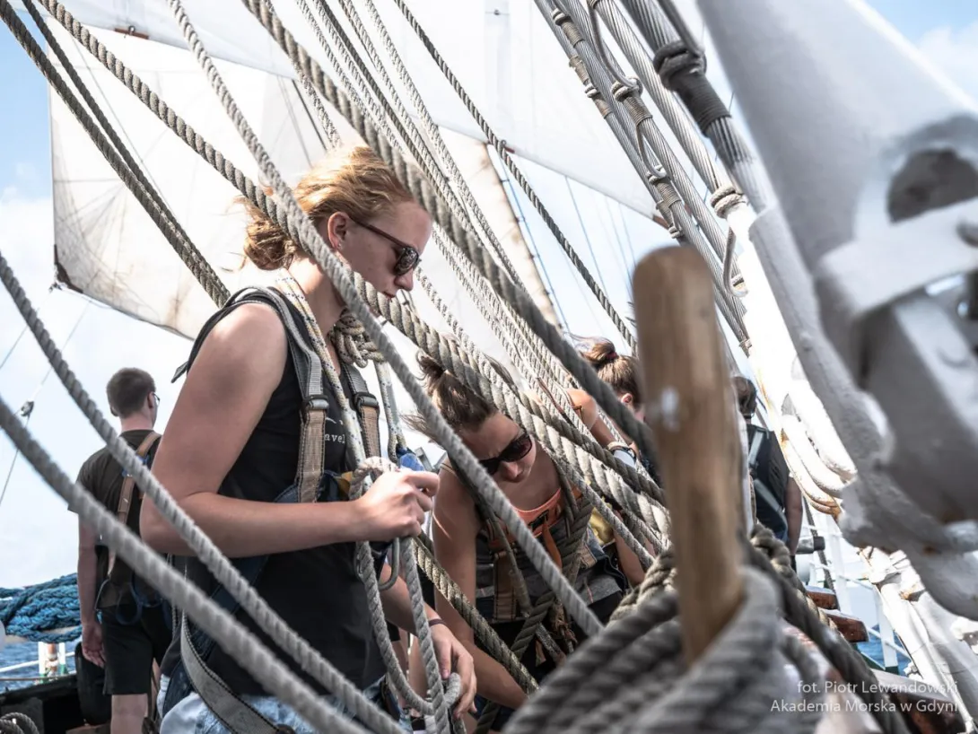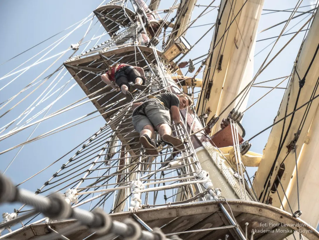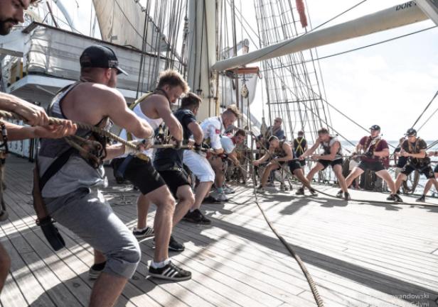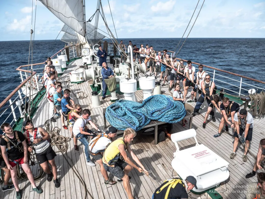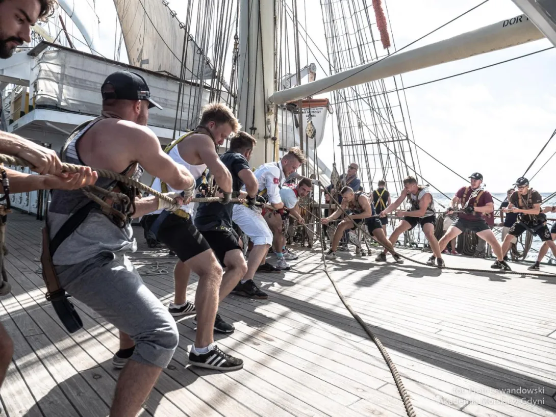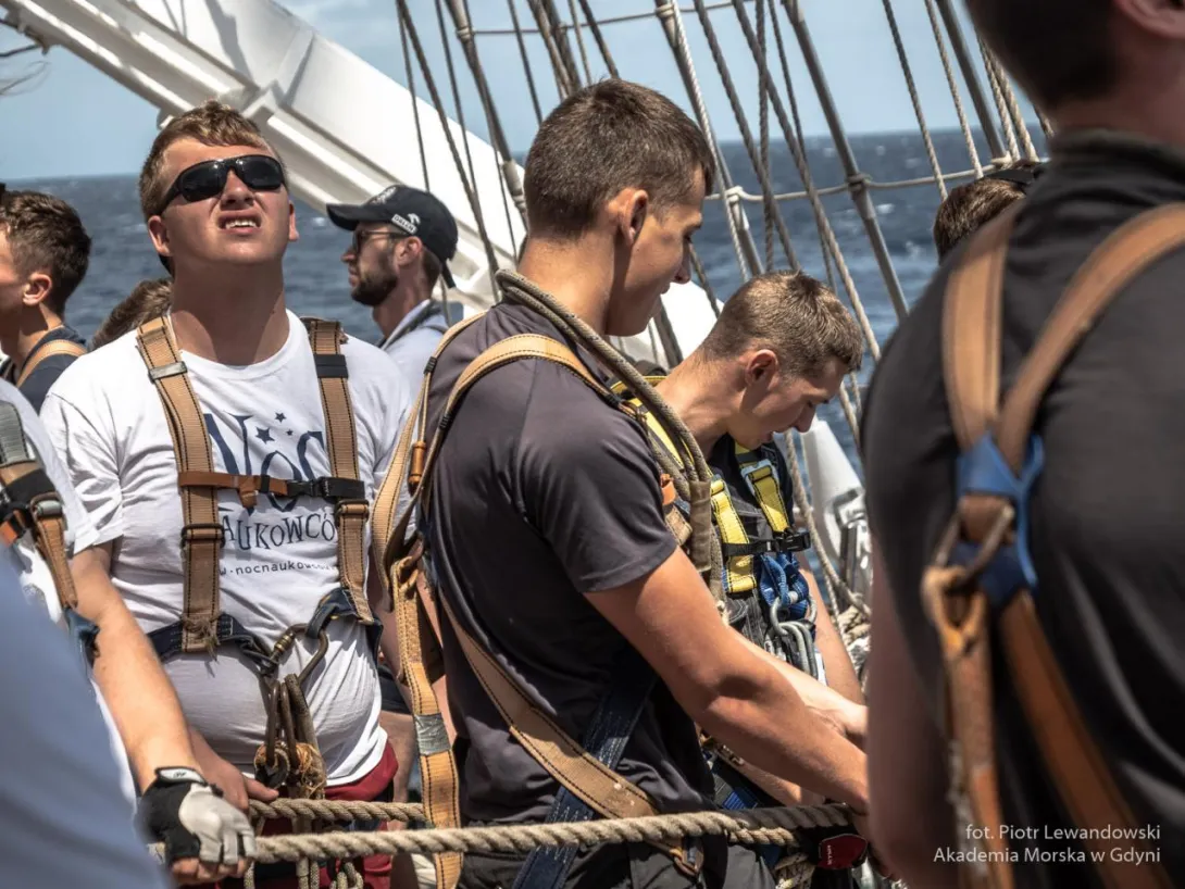 Po 19.00 wszystko było sklarowane, na masztach został tylko zestaw podstawowych żagli: dolne i górne marsle oraz sztaksle. Mam wrażenie, że średni poziom adrenaliny na pokładzie był dużo większy niż przewiduje norma. Praktykanci zmęczeni (czemu skrzętnie zaprzeczali), ale uśmiechnięci, przekonali się, że potrafią więcej niż się spodziewali, a ja, że moja wiara w nich nie była bezpodstawna. Czy ktoś zasłużył na wyróżnienie? Oczywiście, że tak - "team spirit"!