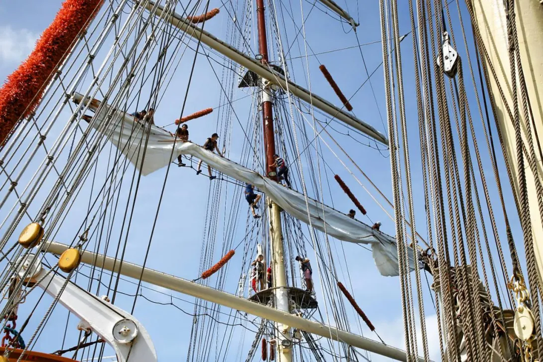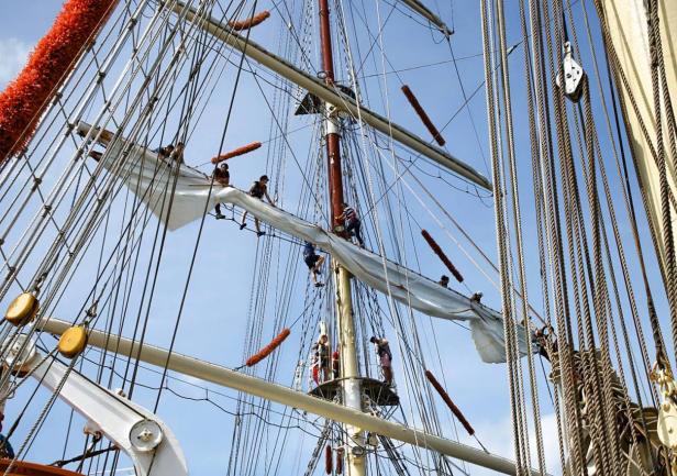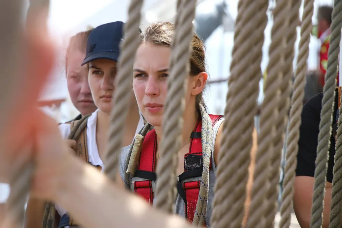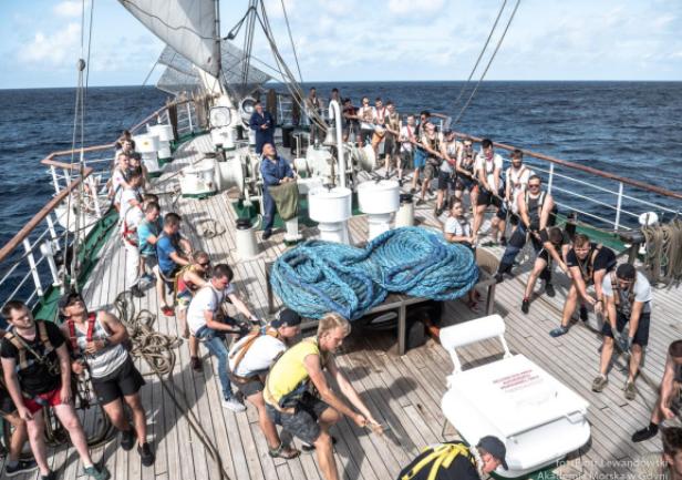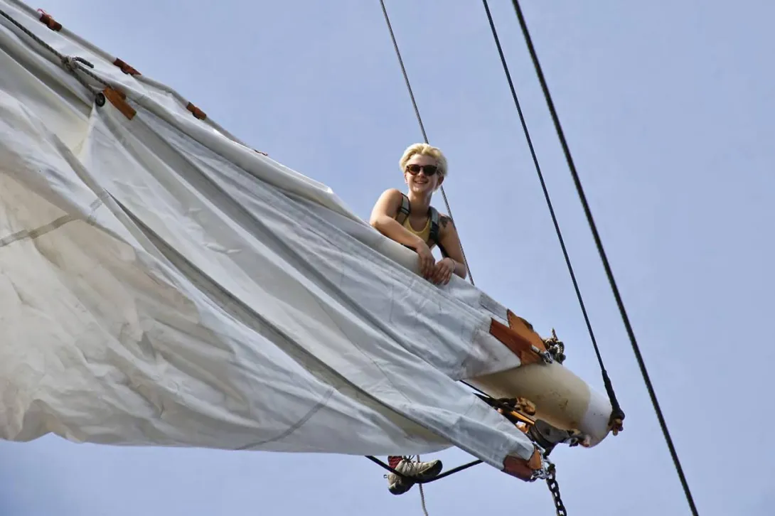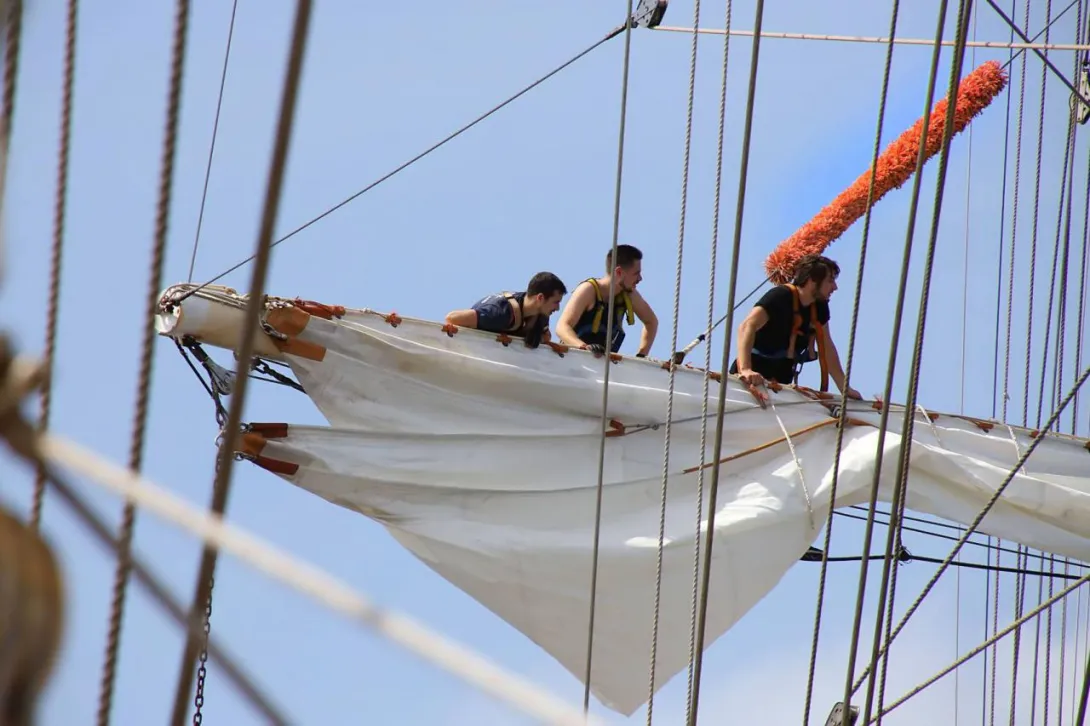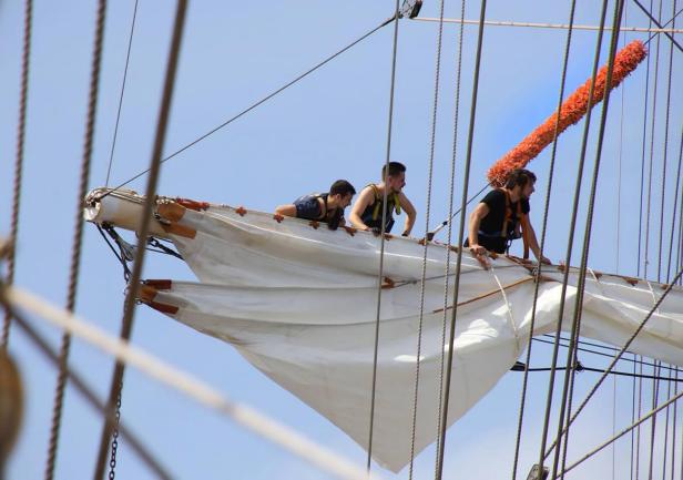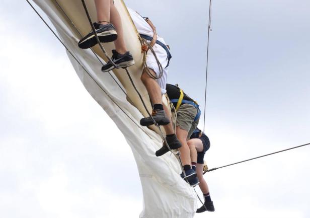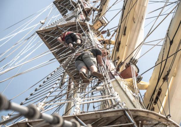 Po 19.00 wszystko było sklarowane, na masztach został tylko zestaw podstawowych żagli: dolne i górne marsle oraz sztaksle. Mam wrażenie, że średni poziom adrenaliny na pokładzie był dużo większy niż przewiduje norma. Praktykanci zmęczeni (czemu skrzętnie zaprzeczali), ale uśmiechnięci, przekonali się, że potrafią więcej niż się spodziewali, a ja, że moja wiara w nich nie była bezpodstawna. Czy ktoś zasłużył na wyróżnienie? Oczywiście, że tak - "team spirit"!