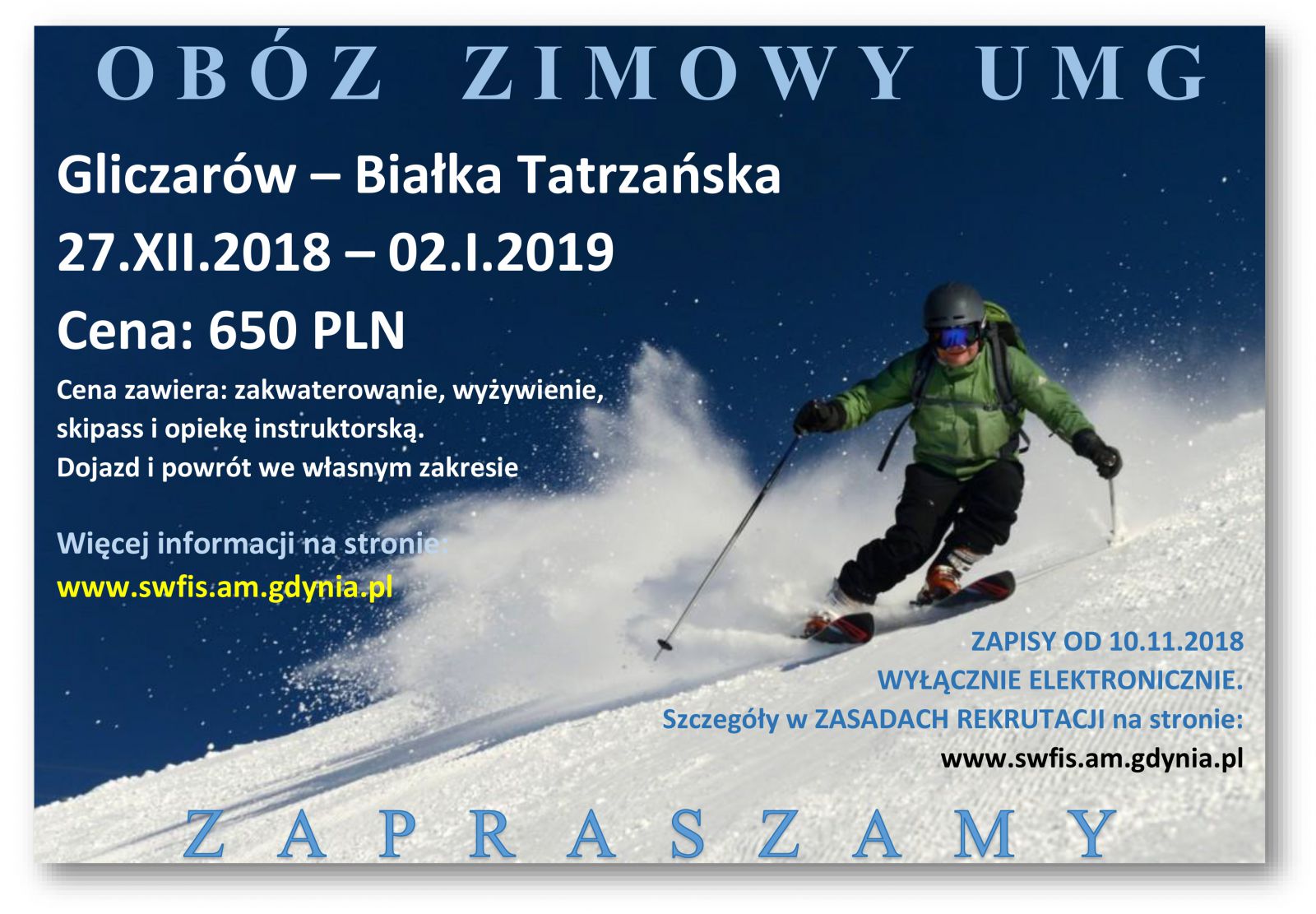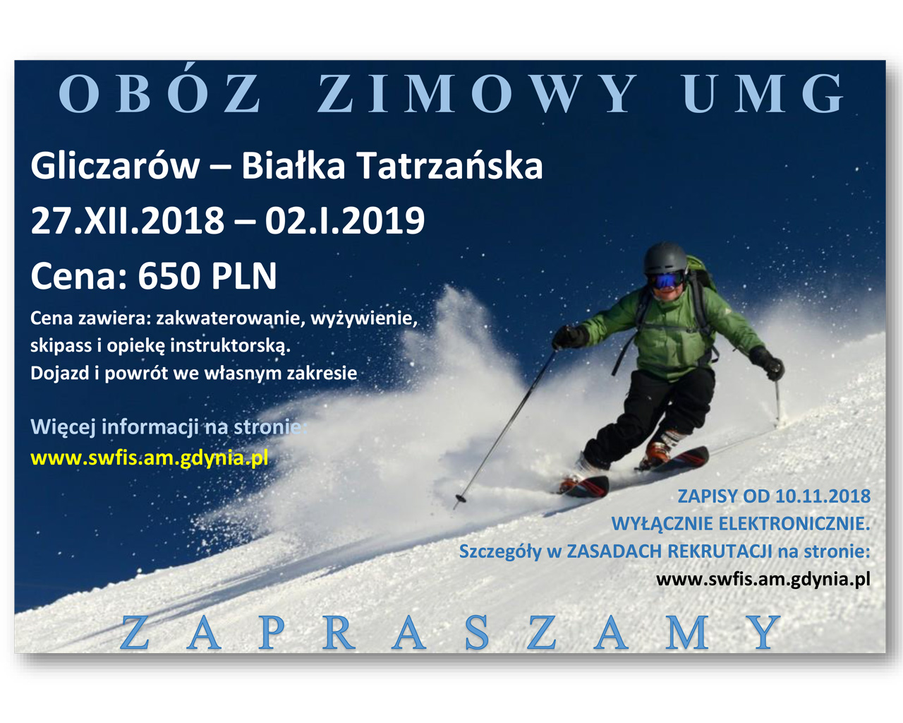 Obóz zimowy 2018 organizowany jest przez Studium Wychowania Fizycznego i Sportu Uniwersytetu Morskiego w Gdyni. Cena dla studenta UMG po uwzględnieniu dofinansowania ze strony uczelni oraz Parlamentu Studentów UMG wynosi 650,00 złotych. Cena zawiera zakwaterowanie (pokoje 2, 3 i 4 osobowe z łazienkami), wyżywienie (śniadania i obiadokolacje), skipassy (ośrodki narciarskie Rusiń-Ski oraz Kotelnica Białczańska) oraz opiekę instruktorską dla grup narciarskich (snowboardziści nie mają zapewnionego instruktora).