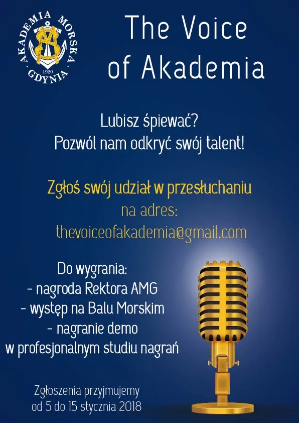 Zgłoś swój udział w przesłuchaniu "The Voice of Akademia" na adres:thevoiceofakademia@gmail.com. Zgłoszenia przyjmowane są do dnia 15 stycznia 2018 roku.
