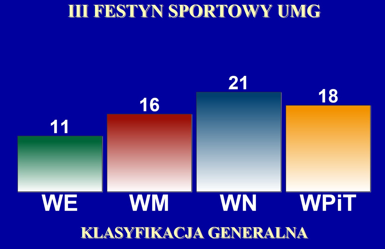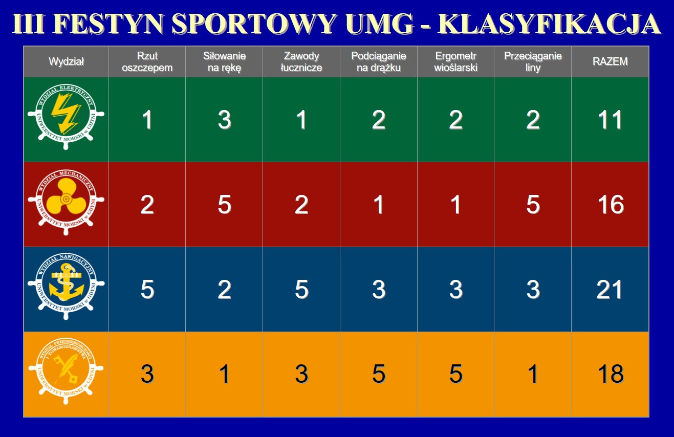 W sportowych zmaganiach wystartowali studenci reprezentujący poszczególne wydziały, zaś w wybranych konkurencjach wzięli udział: rektor, prorektorzy i dziekani. Gościem specjalnym festynu była pani poseł Dorota Arciszewska-Mielewczyk, absolwentka naszej Uczelni. Po wyrównanej walce sędziowie ogłosili wyniki: zwycięstwo odnieśli zawodnicy Wydziału Nawigacyjnego. Drugie miejsce wywalczyła drużyna z Wydziału Przedsiębiorczości i Towaroznawstwa, na trzeciej pozycji uplasował się Wydział Mechaniczny, zaś na czwartej – Wydział Elektryczny. Najlepsi zawodnicy otrzymali nagrody – rektor pogratulował zwycięzcom i wręczył im puchary i medale.