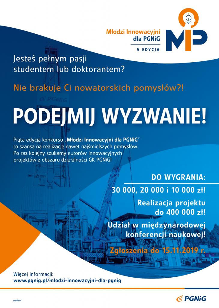Departament Badań i Rozwoju Polskiego Górnictwa Naftowego i Gazownictwa SA ogłosił V edycję konkursu Młodzi Innowacyjni dla PGNiG – MIP 2019, na projekt badawczo-rozwojowy dla GK PGNiG.