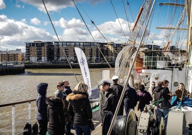 Wyszliśmy z Londynu. Znów Polonia nie zawiodła i musieliśmy przedłużać zaplanowane godziny zwiedzania statku. Było sporo ciekawych spotkań i rozmów. Gościliśmy na statku grupę polskich kombatantów, ministra Marka Gróbarczyka (MGMiŻŚ), przedstawicieli polskich portów i PŻM. Pogoda nas zaskoczyła, bo było zimno, a już dwa tygodnie temu pisano, ze w Londynie jest wiosna. „Dar” stał zacumowany do beczek (boi) na Tamizie i połączenie z lądem zapewniały wynajęte motorówki. Ze statku mieliśmy widok na pięknie pochylone maszty starszej siostry „Daru” - „Cutty Sark” - jednego z najszybszych kliperów w historii żaglowców. Naszą delegację gościła miejscowa Polonia, byliśmy także na koncercie Kat Carr. W ostatni wieczór zaproszono nas na przyjęcie wydane przez Port Gdynia w Old Royal Naval College - przepięknej, zdobionej freskam sali.