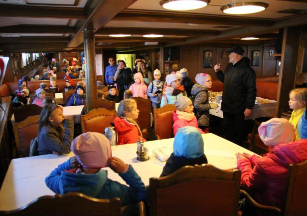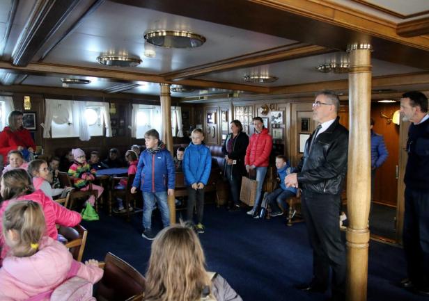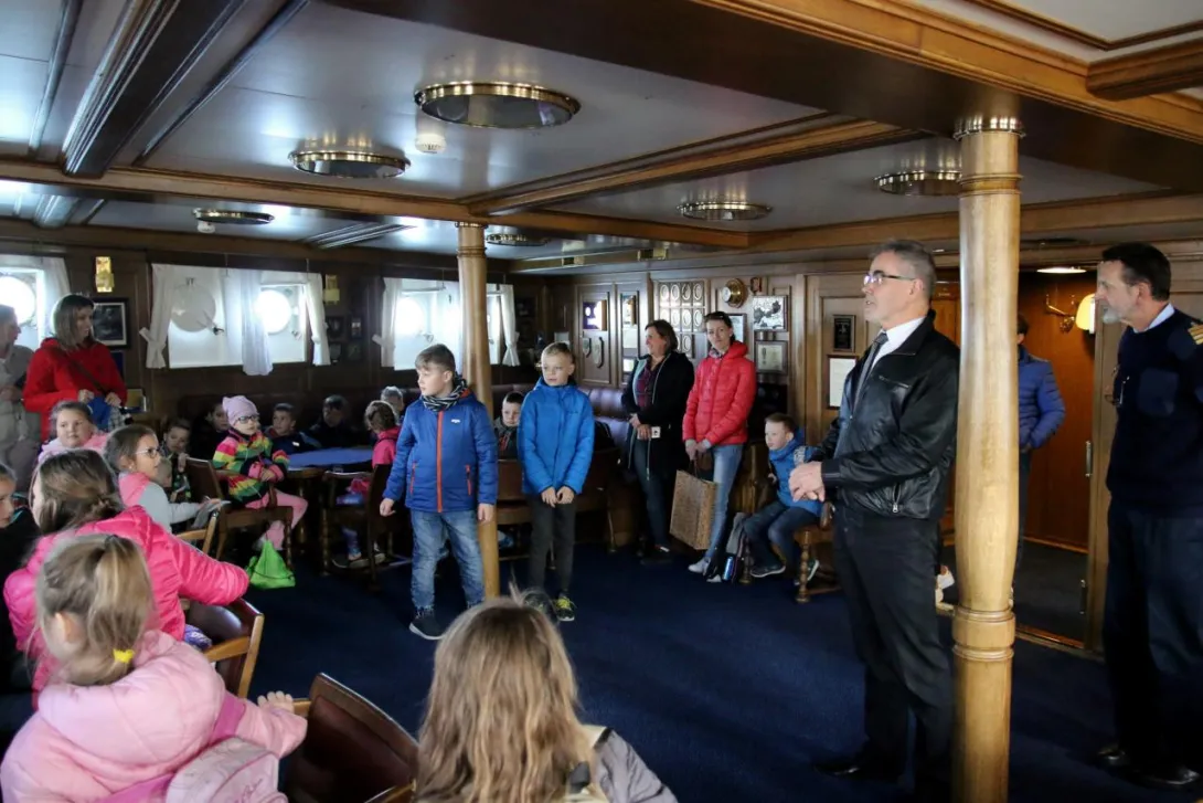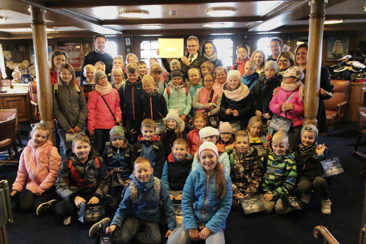 W dniu 14 maja 2019 roku gościliśmy na Darze Młodzieży uczniów ze Szkoły Podstawowej im. ks. Franciszka Sawickiego w Godziszewie. Uczniowie przywitani zostali przez Komendanta Daru Młodzieży, kpt. ż.w. Pana Rafała Szymańskiego. Po pokładzie statku oprowadził ich Oficer Tomasz Maracewicz, który opowiedział o histori statku, praktykach morskich i podróżach. Po słodkim poczęstunku w mesie załogowej uczniowie spotkali się z prof. Januszem Zarębskim, Rektorem Uniwersytetu Morskiego w Gdyni, który wręczył im drobne, pamiątkowe upominki.