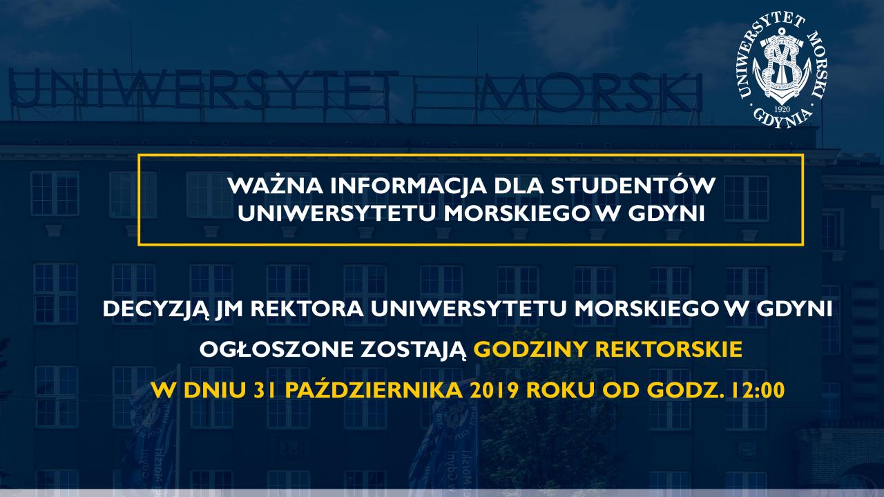 Decyzją JM Rektora Uniwersytetu Morskiego w Gdyni ogłoszone zostają godziny rektorskie w dniu 31 października 2019 roku od godz. 12:00.
