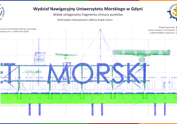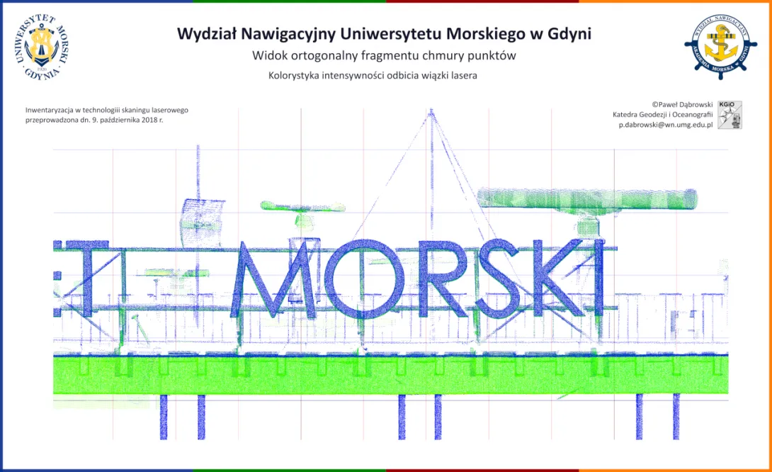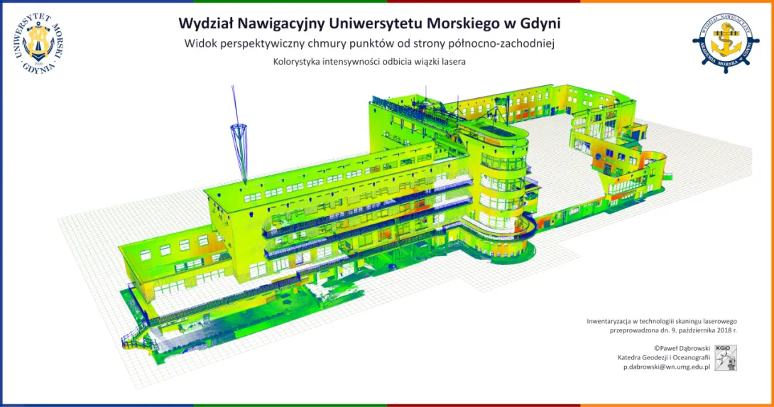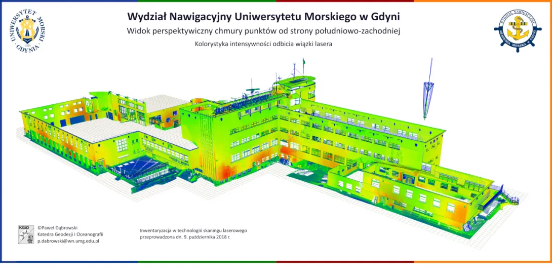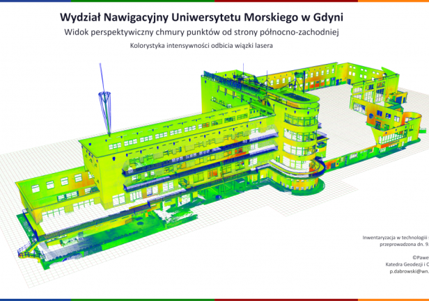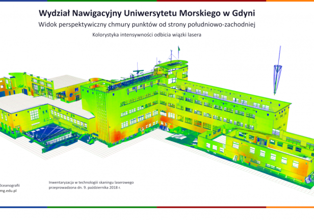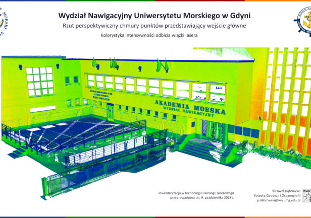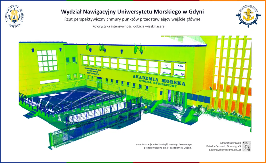 Asystent mgr inż. Paweł Dąbrowski z Katedry Geodezji i Oceanografii wykonał pomiar elewacji budynku Wydziału Nawigacyjnego UMG w technologii naziemnego skaningu laserowego. Badanie pozwoliło zaprezentować detale niewidoczne przy zastosowaniu klasycznych metod pomiaru, a także jest wykorzystywane podczas zajęć dydaktycznych na Uczelni.