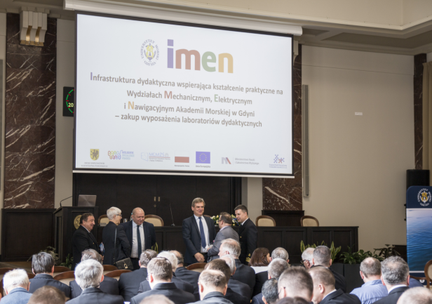 W dniu 10 maja 2019 roku o godz. 11.00 w Auli im. T. Meissnera Uniwersytetu Morskiego w Gdyni odbyło się uroczyste zakończenie realizacji projektu iMEN "Infrastruktura dydaktyczna wspierająca kształcenie na Wydziałach Mechanicznym, Elektrycznym i Nawigacyjnym Akademii Morskiej w Gdyni".