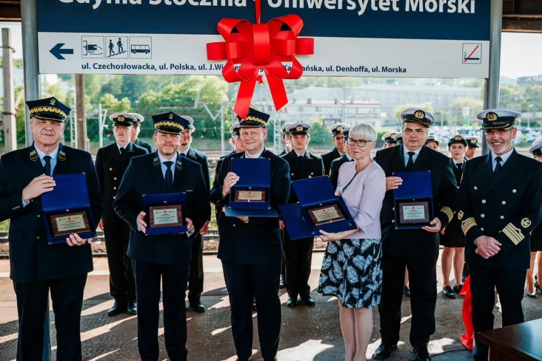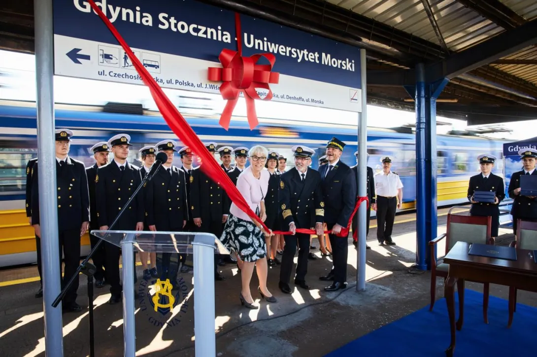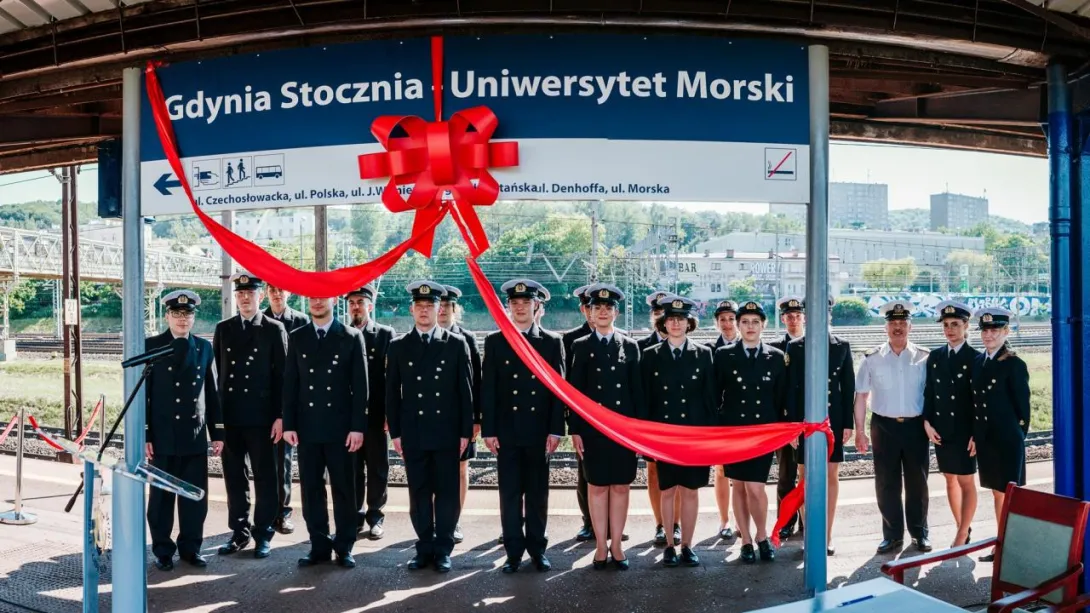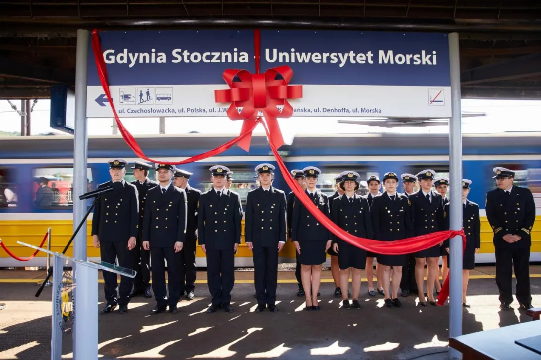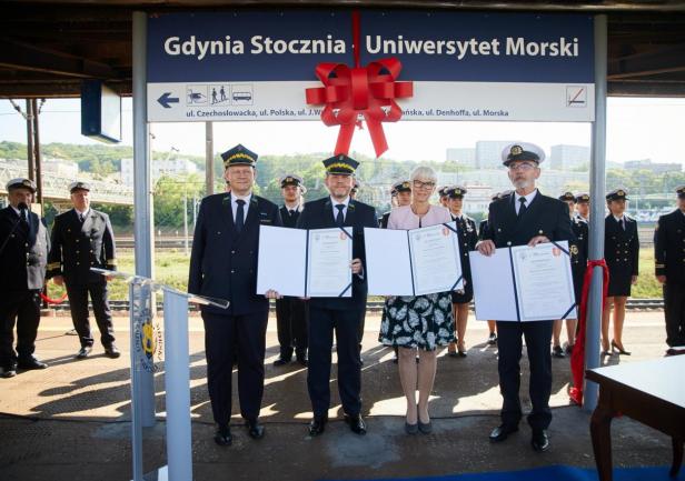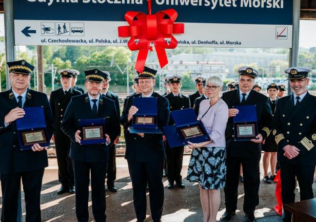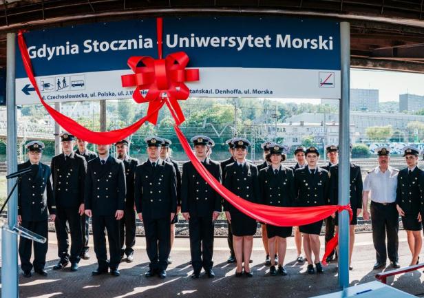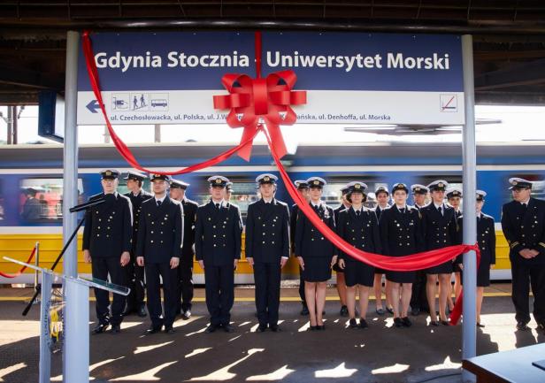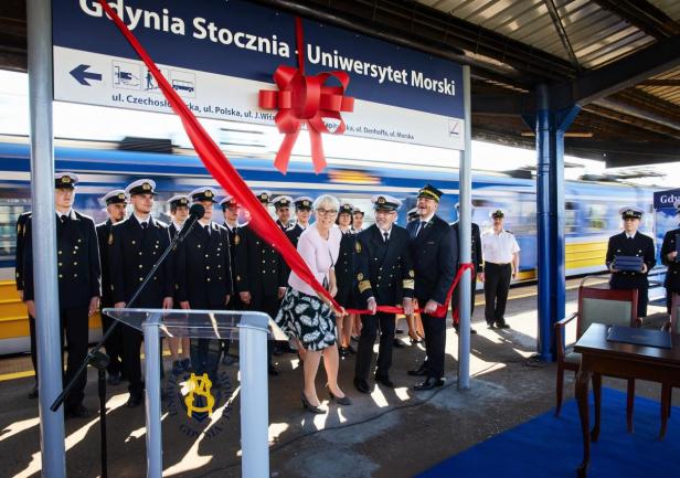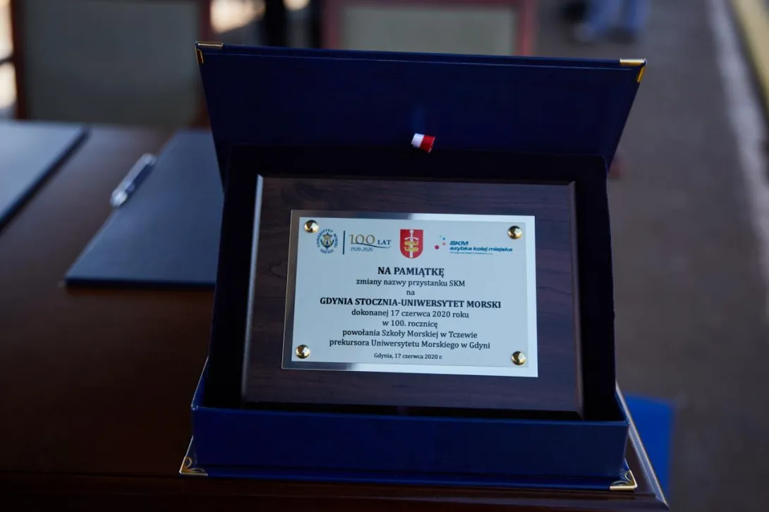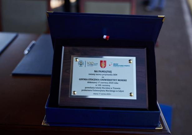 Ostatnim punktem obchodów 100-lecia Uczelni było odsłonięcie nowej nazwy przystanku Gdynia Stocznia. Od 17 czerwca 2020 roku oficjalnie jest to przystanek Gdynia Stocznia - Uniwersytet Morski. W uroczystości wzięli udział JM Rektor prof. Janusz Zarębski, Prezes PKP SKM w Trójmieście sp. z o. o. Maciej Lignowski, Przewodnicząca Rady Miasta Gdyni Joanna Zielińska, członek zarządu PKP S.A. Andrzej Olszewski, rektor-elekt prof. Adam Weintrit, prorektor ds. kształcenia Andrzej Miszczak oraz studenci i pracownicy Uniwersytetu Morskiego, a także pracownicy Szybkiej Kolei Miejskiej. Po krótkich przemówieniach nastąpiło uroczyste odsłonięcie tablicy przystankowej i podpisanie aktu pamiątkowego. JM Rektor wręczył zgromadzonym gościom pamiątkowe ryngrafy oraz zaprosił do wspólnego zdjęcia. Tym miłym akcentem zakończono pierwszy dzień obchodów 100-lecia Uniwersytetu Morskiego w Gdyni.