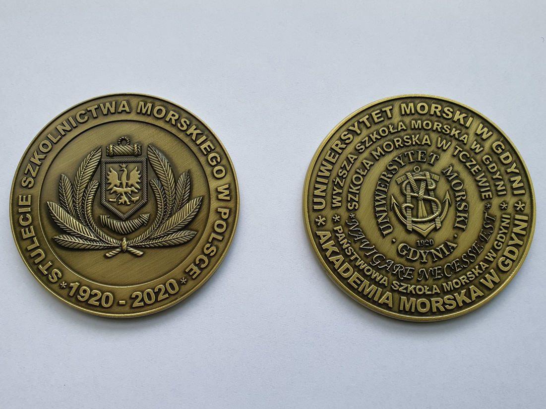 Na zlecenie Fundacji Wsparcia Edukacji Morskiej wybito okolicznościowe medale i przypinkę zaprojektowane przez kpt. ż w. Leszka Góreckiego. Pierwszy medal został wybity w czerwcu tego roku na obchody 100-letniej rocznicy powołania szkolnictwa morskiego w Polsce, a drugi został wybity na Święto Szkoły 8 grudnia. Obok przypinka.