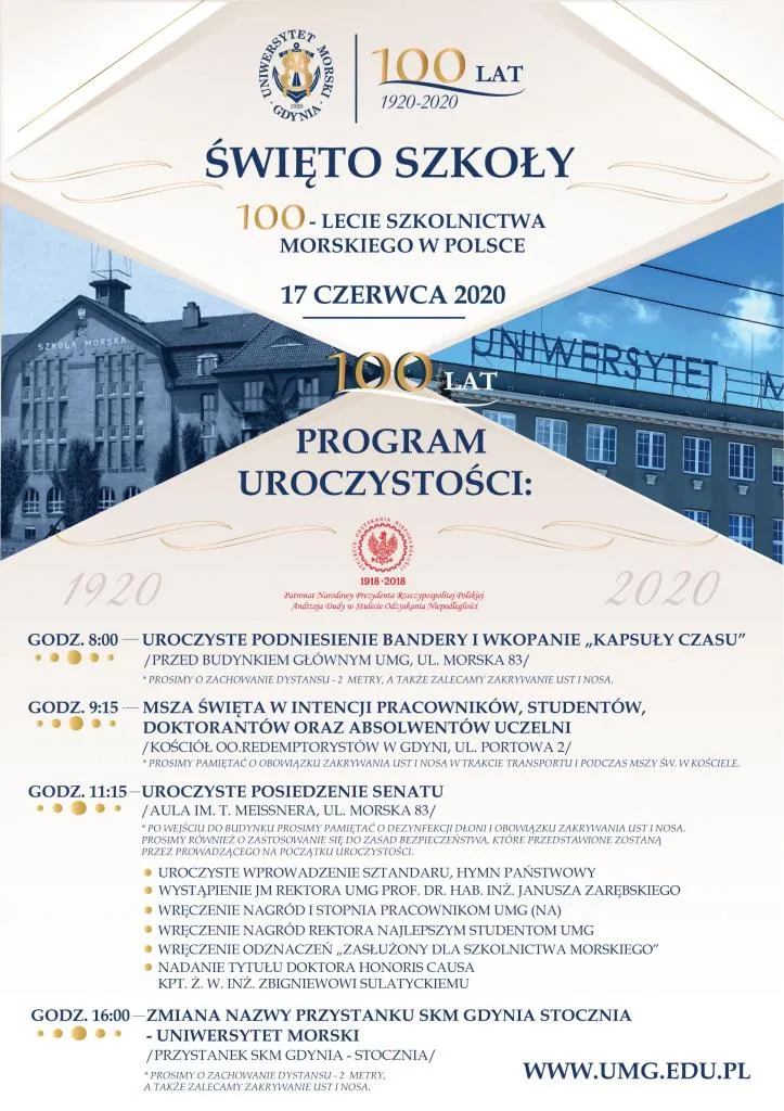 * * Po wejściu do budynku prosimy pamiętać o dezynfekcji dłoni i obowiązku zakrywania ust i nosa. Prosimy również o zastosowanie się do zasad bezpieczeństwa, które przedstawione zostaną przez prowadzącego na początku uroczystości.
