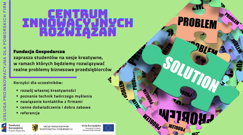 Biuro Karier Studenckich zaprasza na sesje kreatywne usługi CENTRUM INNOWACYJNYCH ROZWIĄZAŃ organizowane przez Fundację Gospodarcza, w ramach których będą rozwiązywane realne problemy biznesowe pomorskich przedsiębiorców.