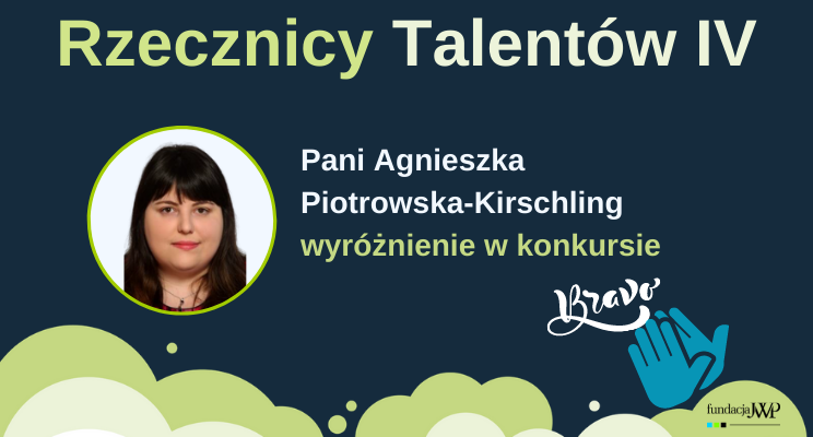 Doktorantka Szkoły Doktorskiej UMG mgr Agnieszka Piotrowska-Kirschling (Wydział Zarządzania i Nauk o Jakości) została wyróżniona w konkursie o staż w ramach projektu edukacyjnego „Rzecznicy Talentów”.