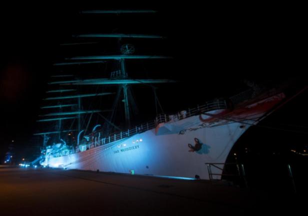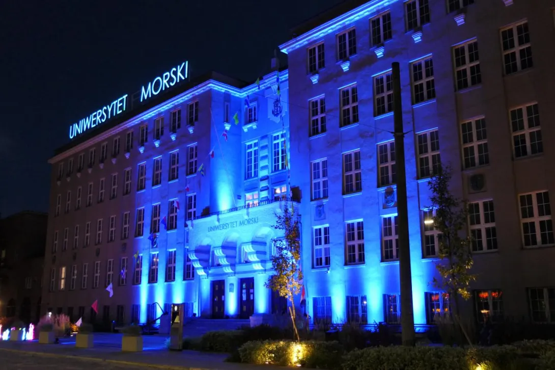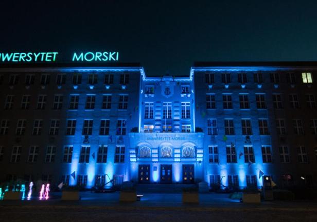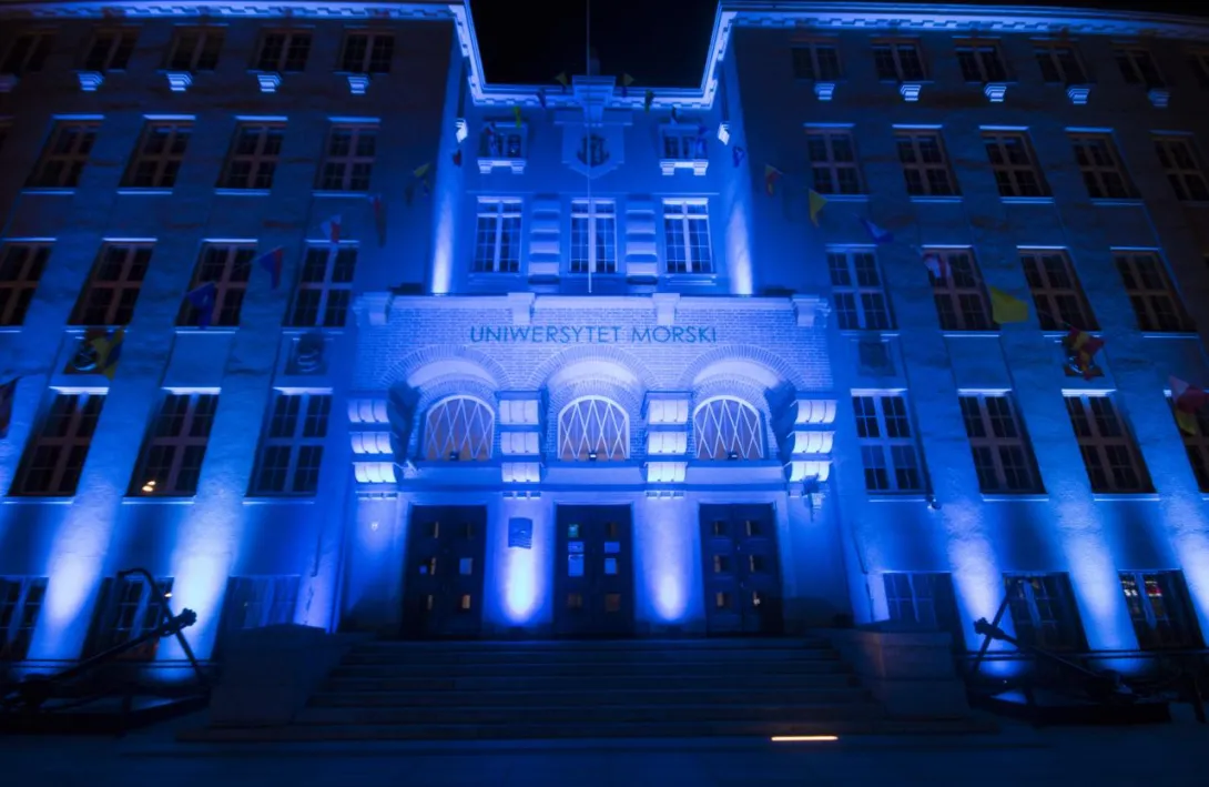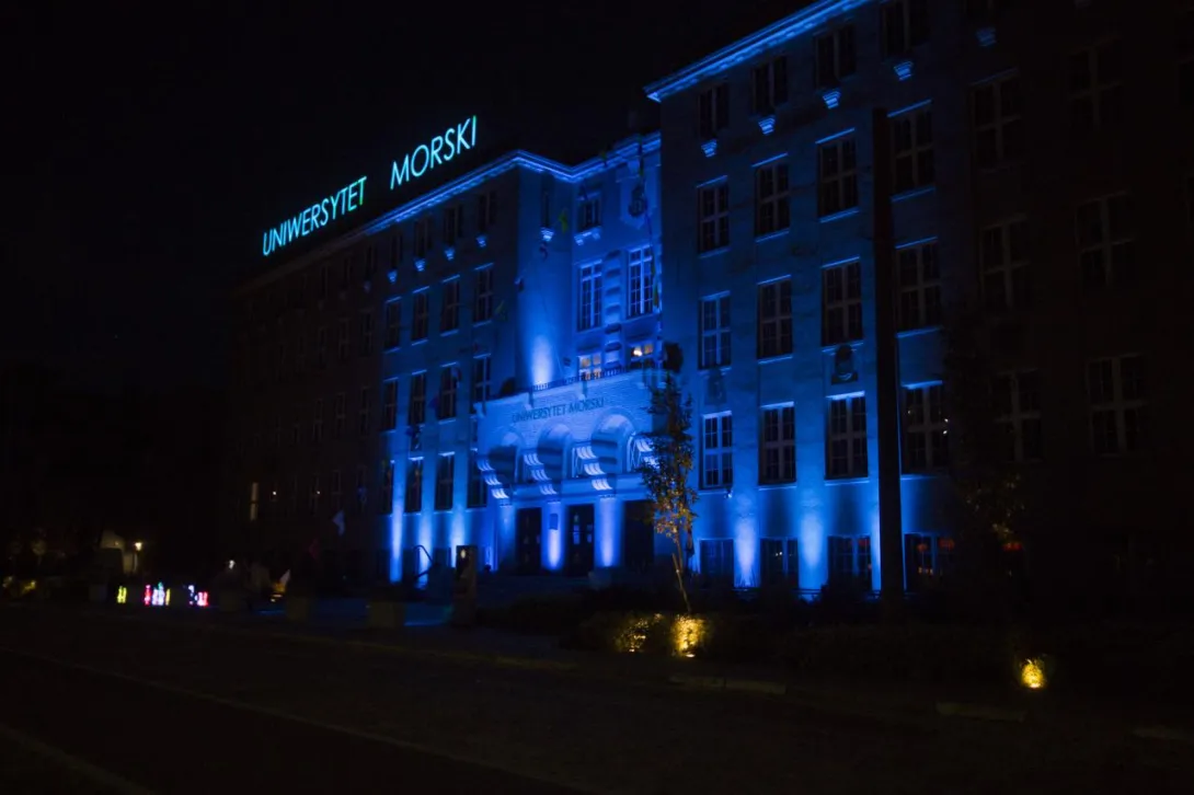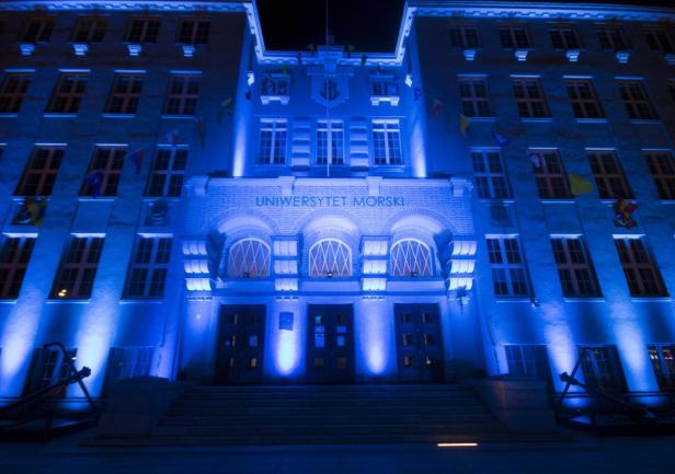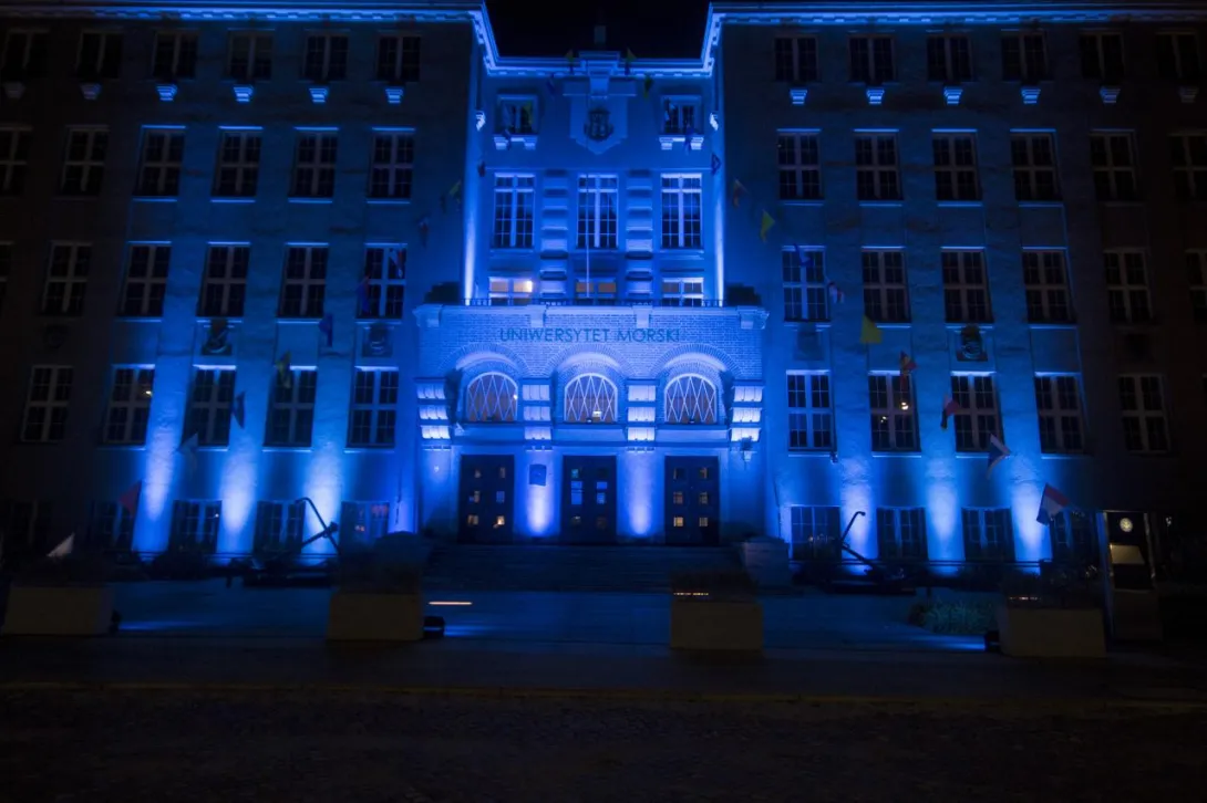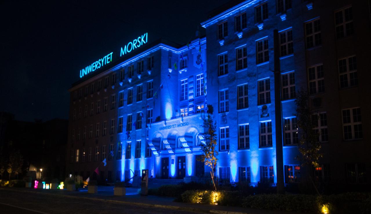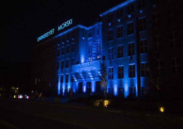 Na niebiesko rozbłysły w czwartkowy wieczór, 30 września br. wybrane obiekty UMG. Tę szczególną oprawę świetlną zyskał żaglowiec „Dar Młodzieży” zacumowany przy Nabrzeżu Pomorskim w Gdyni oraz budynek główny Uniwersytetu Morskiego w Gdyni przy ul. Morskiej.