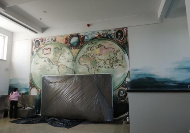 Mural ścienny w budynku Wydziału Nawigacyjnego nawiązuje do stosowanych w XVII wieku rozwiązań malarskich. Joanna Rogowska tak opisuje swoją pracę: - Na mapie przedstawionej przeze mnie możemy zaobserwować różne typy ozdobników i symboli, między innymi są to portrety Gerardusa Mercatora, Klaudiusza Ptolemeusza, Ferdynanda Magellana, Jodocus Hondiusa Starszego. Mapa zawiera także symbole trzech żywiołów w postaci Boga Ognia na rydwanie zaprzęgniętym w dwa ogniste konie, Ziemia po środku symbolizuje wodę, jako pozytywna postać - Bogini Wiatru po prawej. Inne zdobienia to żaglowce, zwierzęta morskie, ozdoby roślinne, owoce, itp.