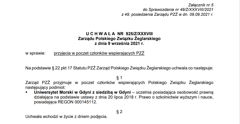 Zarząd Polskiego Związku Żeglarskiego podjął decyzję o przyjęciu Uniwersytetu Morskiego w Gdyni w poczet członków wspierających PZŻ.