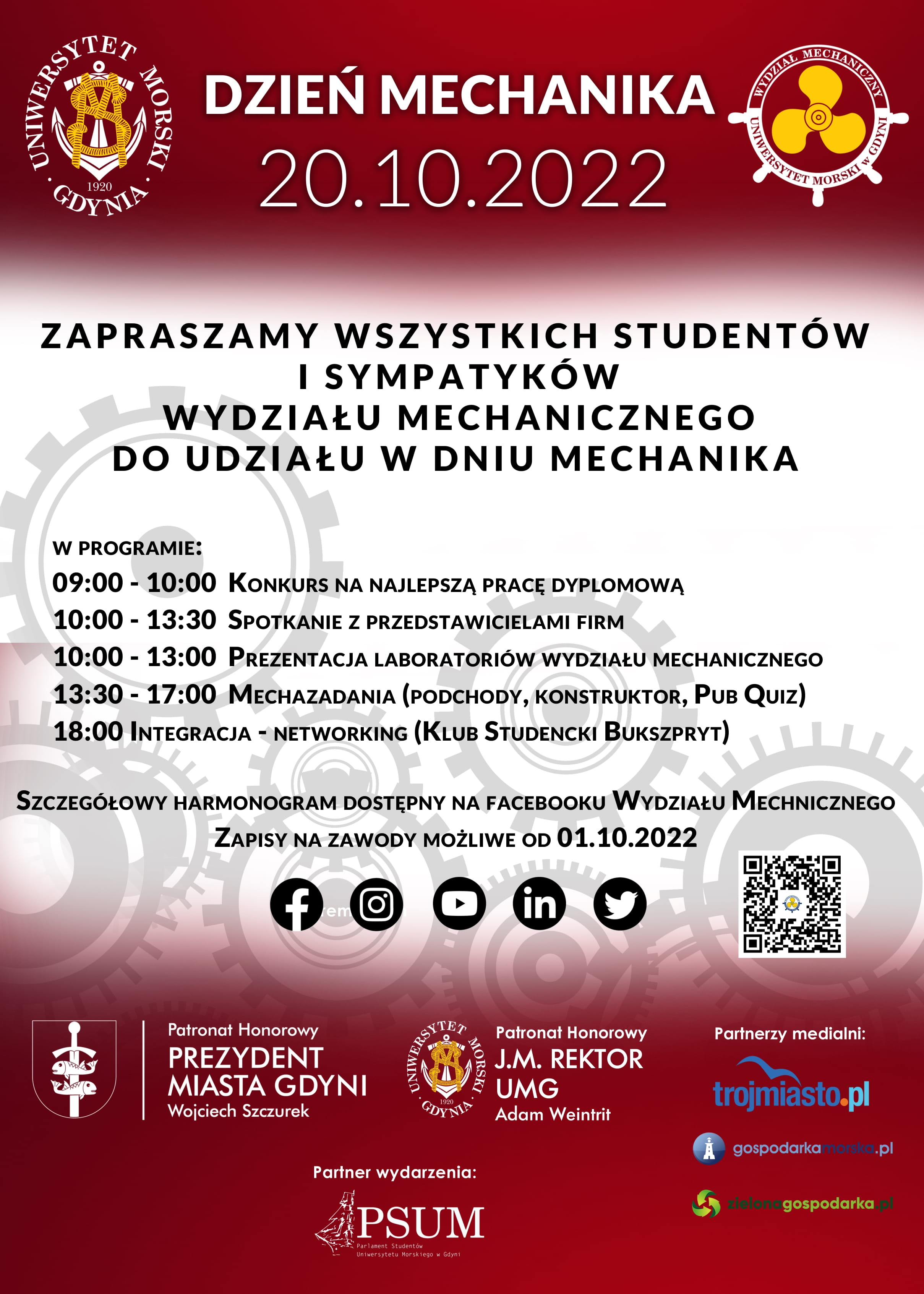 W dniu 20 października 2022 roku na Wydziale Mechanicznym odbędzie się Dzień Mechanika, na który zapraszamy wszystkich studentów i sympatyków Wydziału Mechanicznego. Patronat honorowy nad wydarzeniem sprawują JM Rektor UMG prof. dr hab. inż. kpt. ż.w. Adam Weintrit oraz Prezydent Miasta Gdyni dr Wojciech Szczurek.
