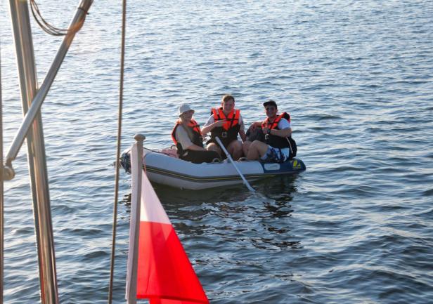 Pogoda dopisywała, humory również, więc rejs był bardzo udany i pouczający. Pierwszy postój zaplanowano na kotwicowisku w Rewie, gdzie korzystając z pięknej pogody, zażywano kąpieli w morzu, a następnie wykorzystując ponton pokładowy Nesta, eksplorowano Cypel Rewski, gwarowo nazywany Szperkiem