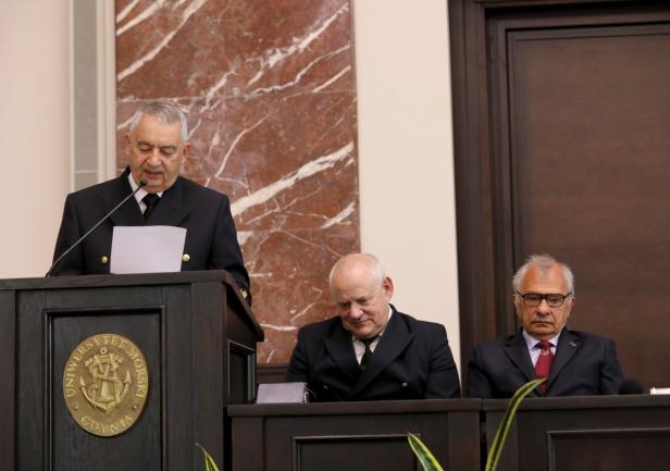 Składając podziękowania Profesorowi Jurdzińskiemu za wybitny wkład w rozwój Uczelni oraz rozwój polskiej szkoły nawigacji i szkolnictwa morskiego, prof. dr hab. Piotr Jędrzejowicz oddał głos JM Rektorowi UMG, który odczytał akt nadania godności Doktora Honoris Causa.