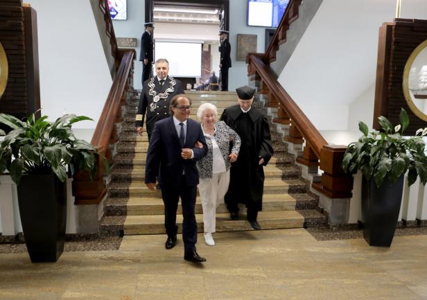 - Historia Gdyni, a szczególnie historia ludzi związanych z tą Uczelnią to historia niezwykła. Morze zawsze nie tylko było elementem budowania szkoły charakterów, ale także takim miejscem, które przyciągało ludzi niezwykłych, ludzi z pasjami, ludzi, którzy swoją odwagą, determinacją mieli odwagę zmieniać świat. Taką osobą bez wątpienia jest osoba Pana Profesora. Myślę, że Jego nie tylko wybitny dorobek naukowy, badawczy, ale to, co mieliście Państwo wszyscy okazję nie tylko dziś, ale też przez lata pracy Pana Profesora, ja także, przy wielu okazjach poznać, to niezwykła otwartość, niezwykłe ciepło, życzliwość, wyrozumiałość dla wszystkich, z którymi się Pan Profesor stykał. Chciałabym Panu Profesorowi w imieniu wszystkich mieszkańców naszego miasta nisko się pokłonić, bardzo serdecznie podziękować za ten dorobek, który współtworzy dzisiaj historię Uniwersytetu Morskiego, ważnej części nie tylko Polski morskiej, ale także ważnej instytucji w życiu naszego miasta. Chcę podziękować za Pana pracę, za Pana uśmiech, za Pana ciepło, za to wszystko, co czynił Pan dla pokoleń, wychowując kadry Polski morskiej. Panie Profesorze, Gdynia kłania się w pas dorobkowi i wielkiemu urokowi, charakterowi Pana Profesora!